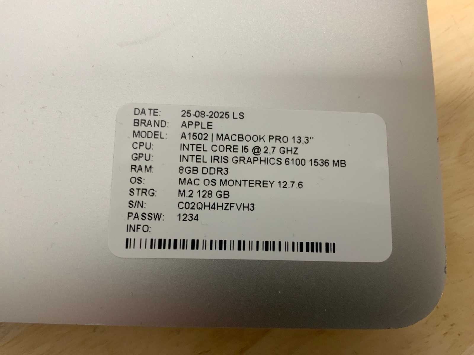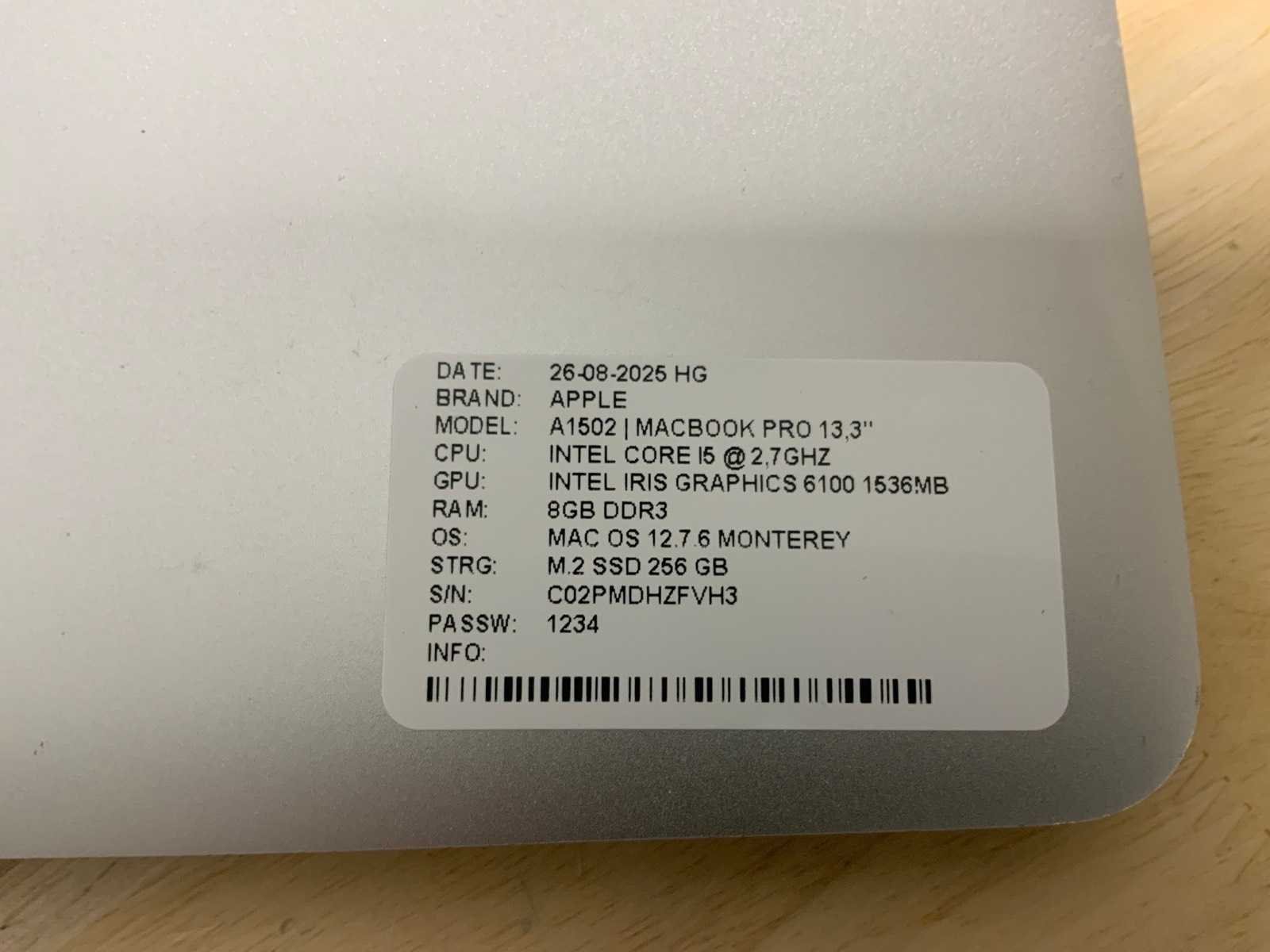 Merk: Apple Type: MACBook Pro A1502 Processor type: Intel core i5 RAM Geheugen: 8GB RAM Geheugen Type: DDR3 Type datadrager: SSD Aantal datadragers: 1 Type videokaart: Intel Iris Graphics 6100 Besturingssysteem: Monterey Licentie: Nvt Zonder adapter: true Beelddiagonaal: 13'' Wifi: true Bluetooth: true USB-Type: USB-A USB poorten: 2 Thunderbolt: true HDMI: 1