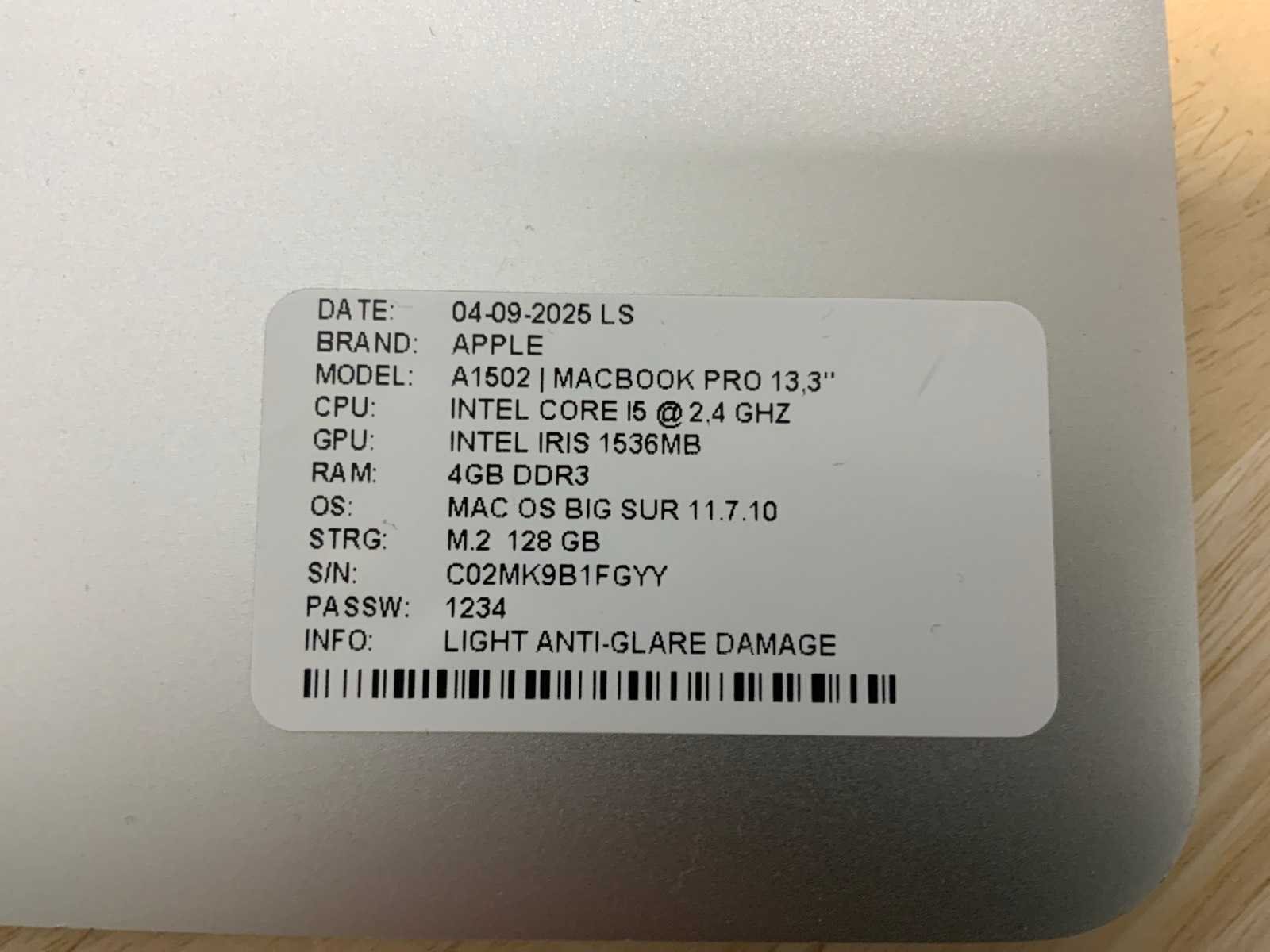 Merk: Apple Type: MACBook Pro A1502 Processor type: Intel core i5 Processorsnelheid Ghz: 1,4 RAM Geheugen: 4GB RAM Geheugen Type: DDR3 Totale opslagcapaciteit: 128GB Type datadrager: SSD Aantal datadragers: 1 Type videokaart: Intel Iris Graphics Besturingssysteem: Big sur Licentie: Nvt Zonder adapter: true Beelddiagonaal: 13'' Wifi: true Bluetooth: true USB-Type: USB-A USB poorten: 2 Thunderbolt: true HDMI: 1