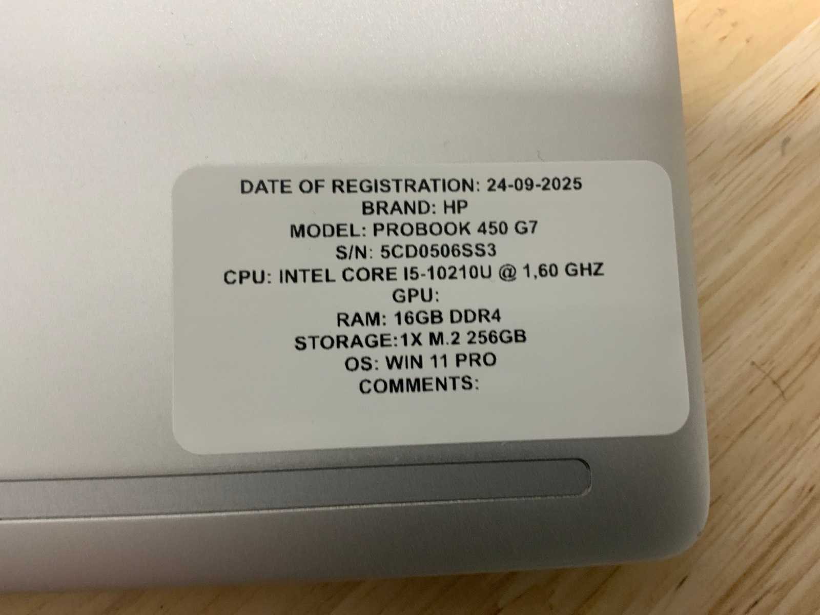 Merk: HP Type: Probook 450 G7 Processor type: Intel core i5-10210U Processorsnelheid Ghz: 1,60 RAM Geheugen: 16GB RAM Geheugen Type: Ddr4 Totale opslagcapaciteit: 256GB Aantal datadragers: 1 Besturingssysteem: Windows 11 pro Licentie: Onboard Zonder adapter: true Wifi: true USB-Type: Usb-A/Usb-C USB poorten: 4 Card reader: true Koptelefoon aansluiting: true Webcam: true Toetsenbord: Qwerty HDMI: 1