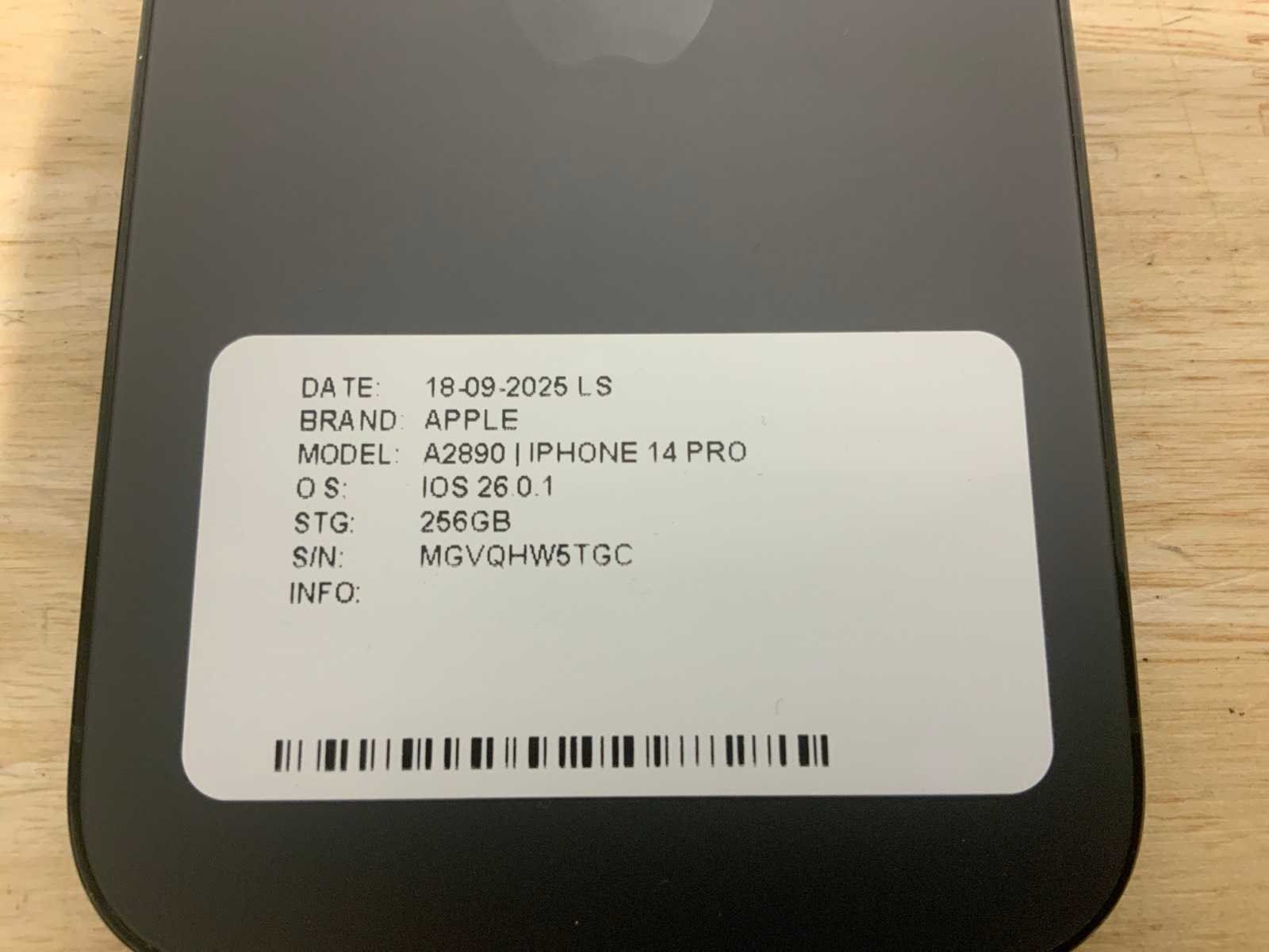 Merk: Apple Type: iPhone 14 pro A2890 Draadloos opladen: true Quick charge functie: true Wifi: true Bluetooth: true Video functie: true Gezichtsherkenning: true Geïntegreerde flits: true Frontcamera: true Camera: true Touchscreen: true Simlock vrij: true Opslagcapaciteit: 256GB Besturingssysteem: IOS 26.01 Zonder oplader: true Refurbished: true