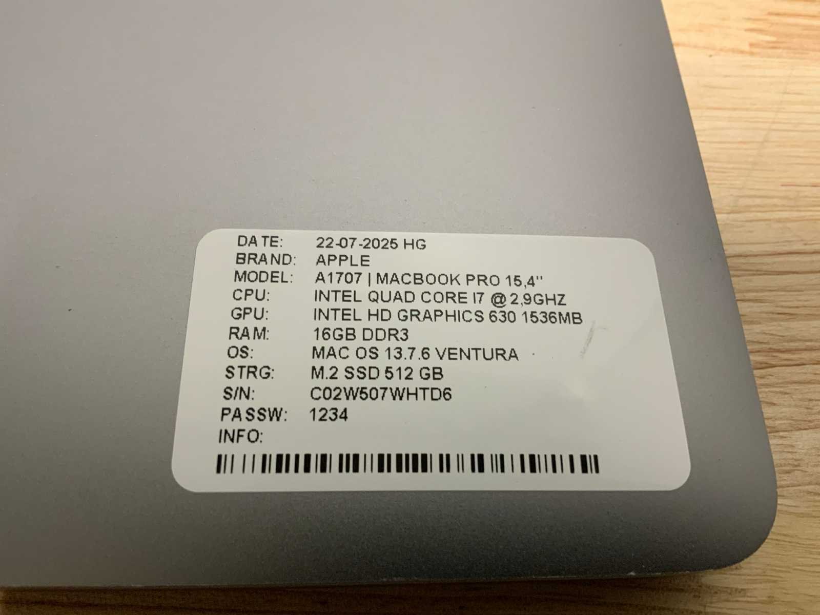 Merk: Apple Type: A1707 MacBook Pro(i7) Processor type: Intel core i7 Processorsnelheid Ghz: 2,90 RAM Geheugen: 16GB RAM Geheugen Type: DDR4 Totale opslagcapaciteit: 512GB Type datadrager: Onboard Type videokaart: Intel hd graphics 630 Besturingssysteem: Ventura Zonder adapter: true Wifi: true Bluetooth: true USB-Type: USB-C USB poorten: 4 Koptelefoon aansluiting: true Webcam: true Toetsenbord: QWERTY