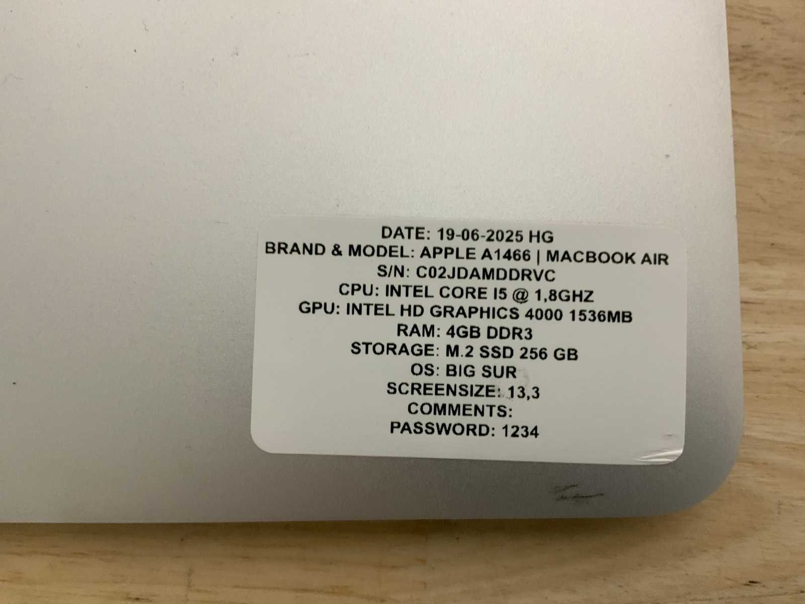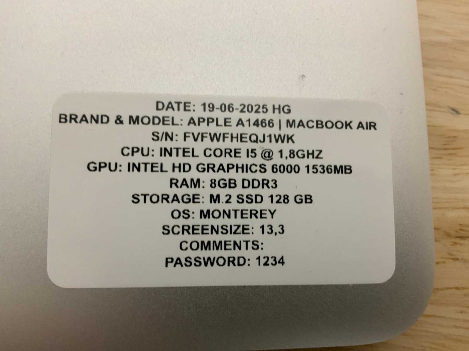 Merk: Apple Type: MACBook Air A1466 Processor type: Intel core i5 RAM Geheugen Type: DDR3 Type datadrager: M.2 NVMe Aantal datadragers: 1 Type videokaart: Intel HD Graphics Besturingssysteem: Zie fotos Zonder adapter: true Beelddiagonaal: 13'' Wifi: true Bluetooth: true USB-Type: USB-A USB poorten: 2 Card reader: true Thunderbolt: true Koptelefoon aansluiting: true Webcam: true Toetsenbord: QWERTY
