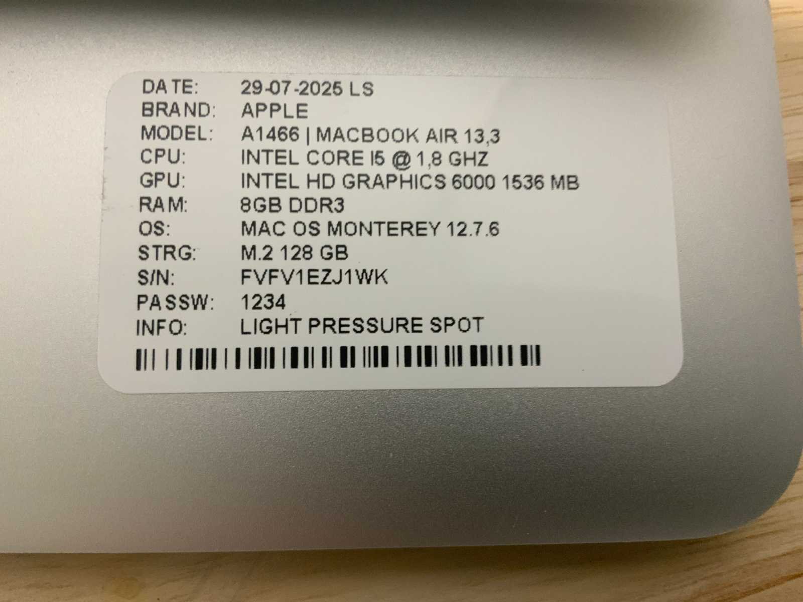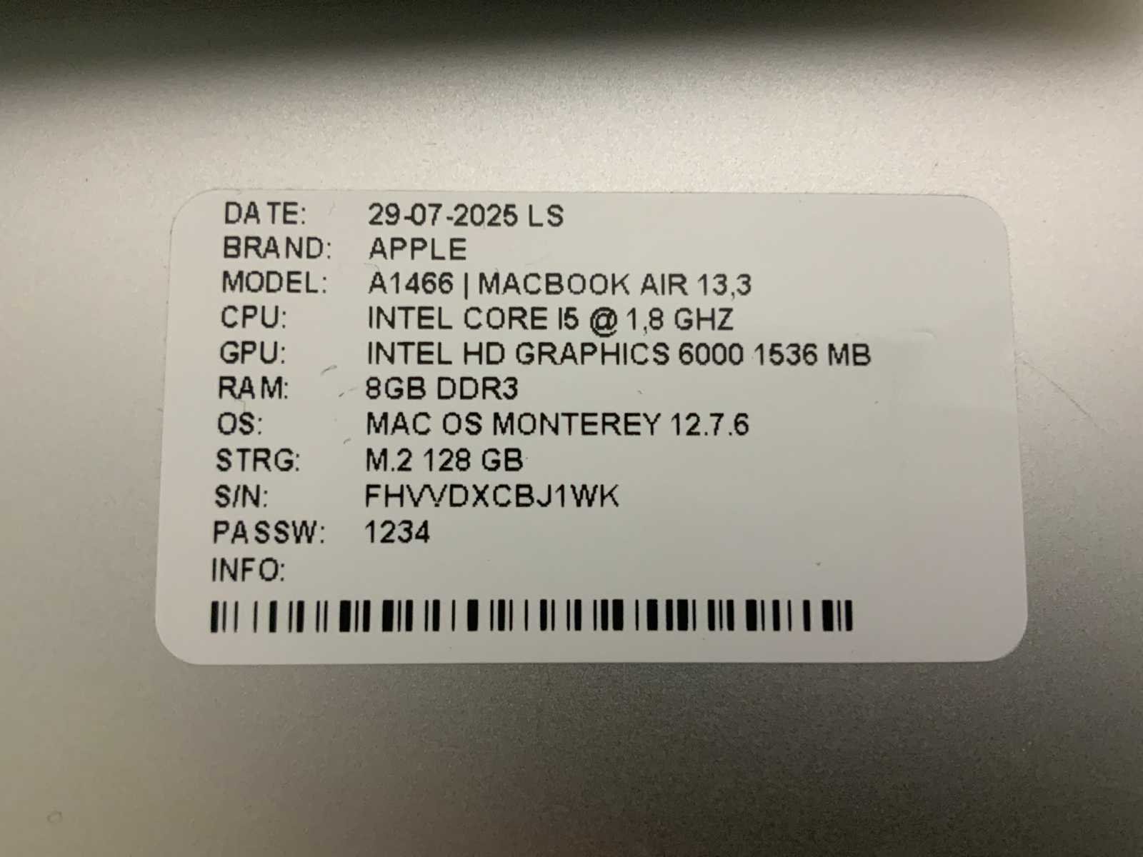 Merk: Apple Type: MACBook Air A1466 Processor type: Intel core i5 RAM Geheugen: 8GB RAM Geheugen Type: DDR3 Totale opslagcapaciteit: 128GB Type datadrager: M.2 NVMe Aantal datadragers: 1 Type videokaart: Intel HD Graphics 6000 Besturingssysteem: Monterey Zonder adapter: true Beelddiagonaal: 13'' Wifi: true Bluetooth: true USB-Type: USB-A USB poorten: 2 Card reader: true Thunderbolt: true Koptelefoon aansluiting: true Webcam: true Toetsenbord: QWERTY