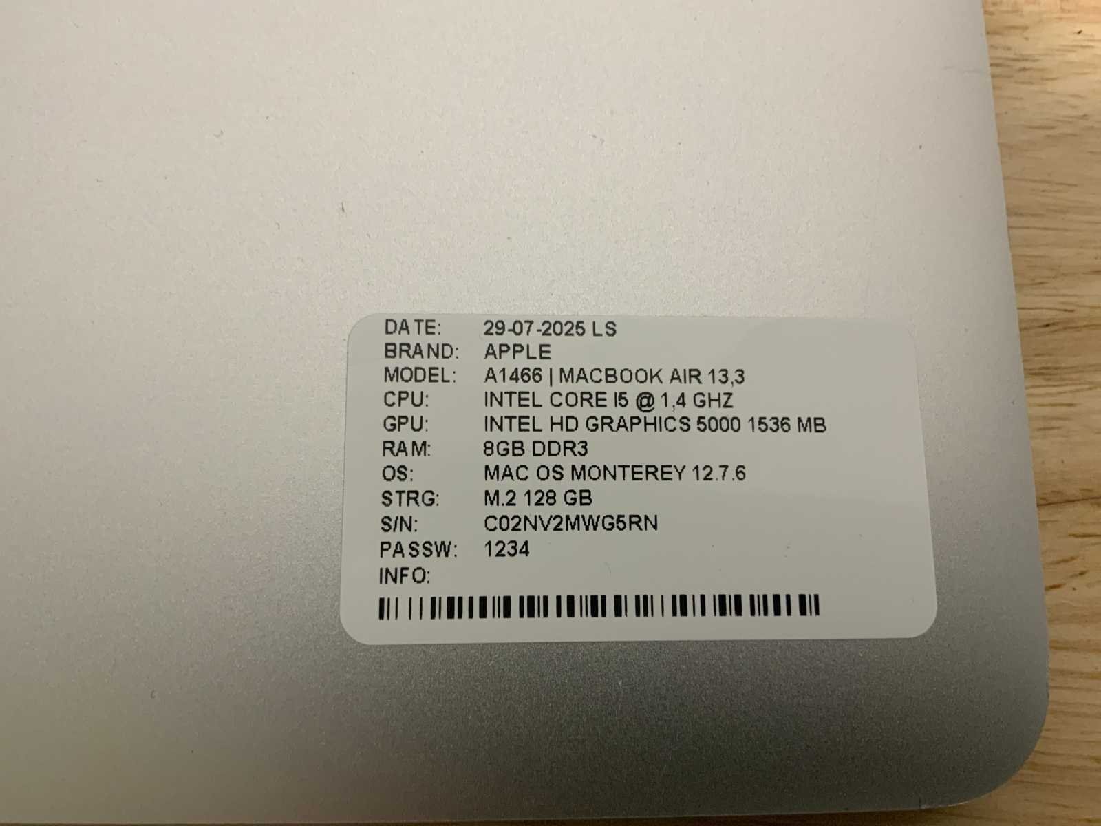 Merk: Apple Type: MACBook Air A1466 Processor type: Intel core i5 Processorsnelheid Ghz: 1,40 RAM Geheugen: 4GB RAM Geheugen Type: DDR3 Totale opslagcapaciteit: 128GB Type datadrager: M.2 NVMe Aantal datadragers: 1 Type videokaart: Intel HD Graphics 5000 Besturingssysteem: BigSur/monterey Zonder adapter: true Beelddiagonaal: 13'' Wifi: true Bluetooth: true USB-Type: USB-A USB poorten: 2 Card reader: true Thunderbolt: true Koptelefoon aansluiting: true Webcam: true Toetsenbord: QWERTY