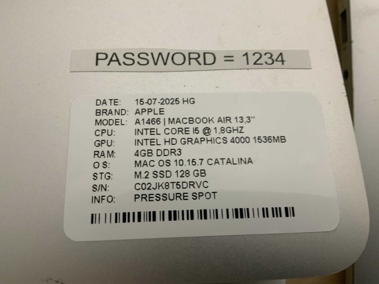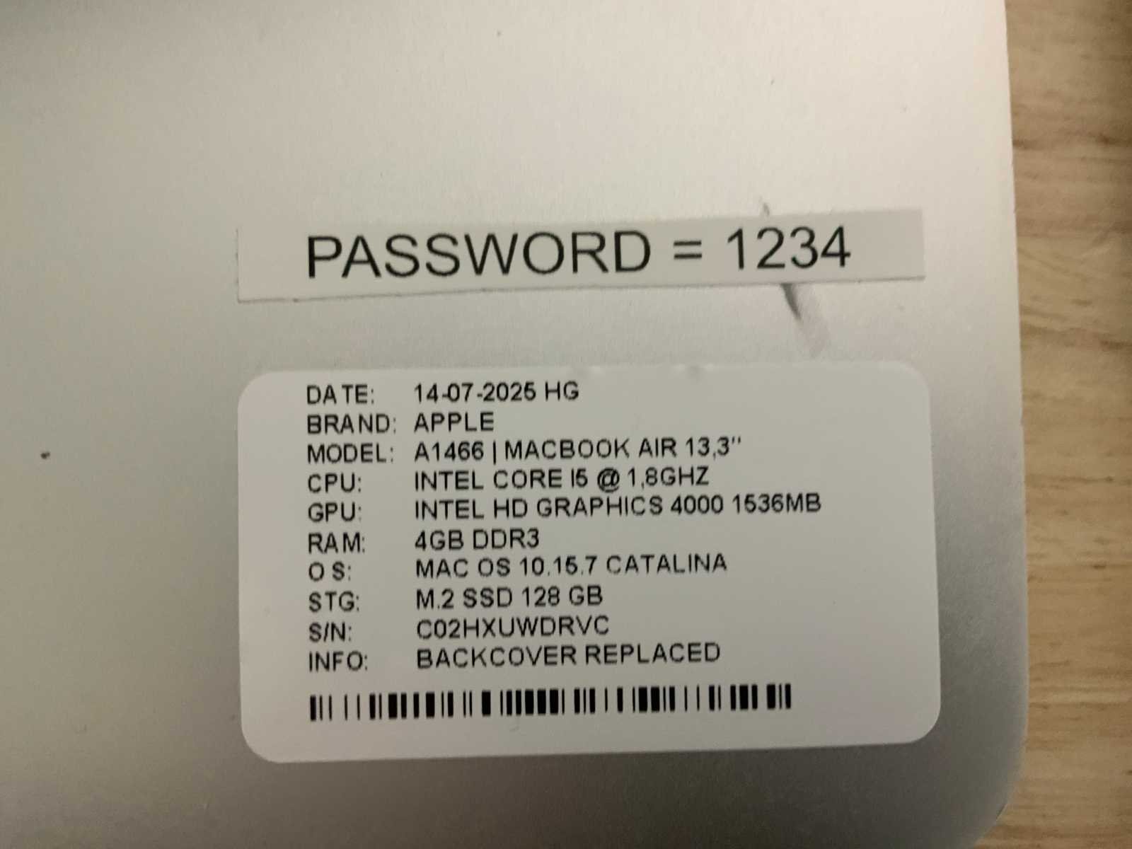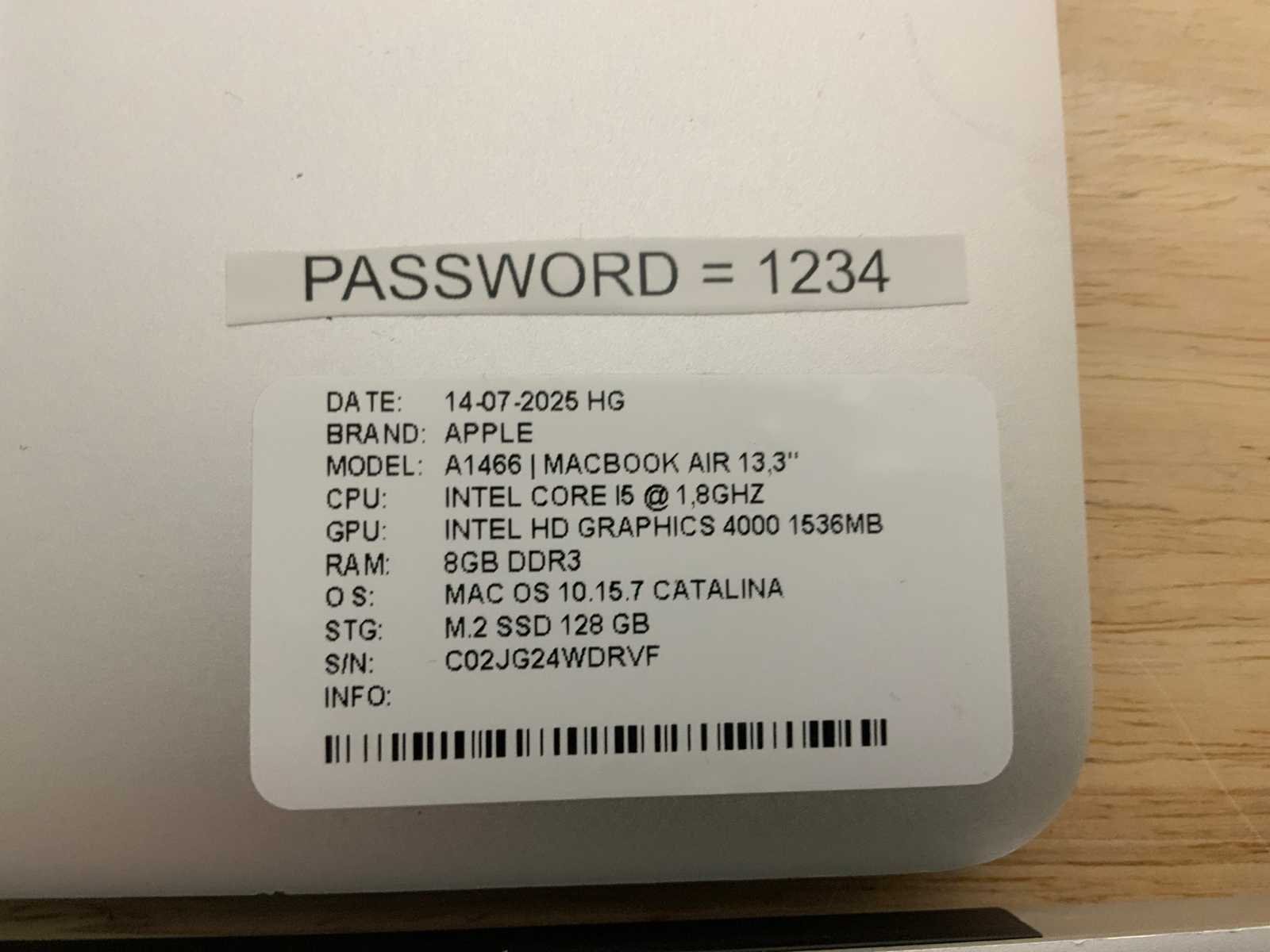 Merk: Apple Type: MACBook Air A1466 Processor type: Intel core i5 Processorsnelheid Ghz: 1,80 RAM Geheugen Type: DDR3 Totale opslagcapaciteit: 128GB Type datadrager: M.2 NVM3 Aantal datadragers: 1 Type videokaart: Intel hd graphics 4000 Besturingssysteem: Monterey Zonder adapter: true Beelddiagonaal: 13'' Wifi: true Bluetooth: true USB-Type: USB-A USB poorten: 2 Thunderbolt: true Koptelefoon aansluiting: true Webcam: true