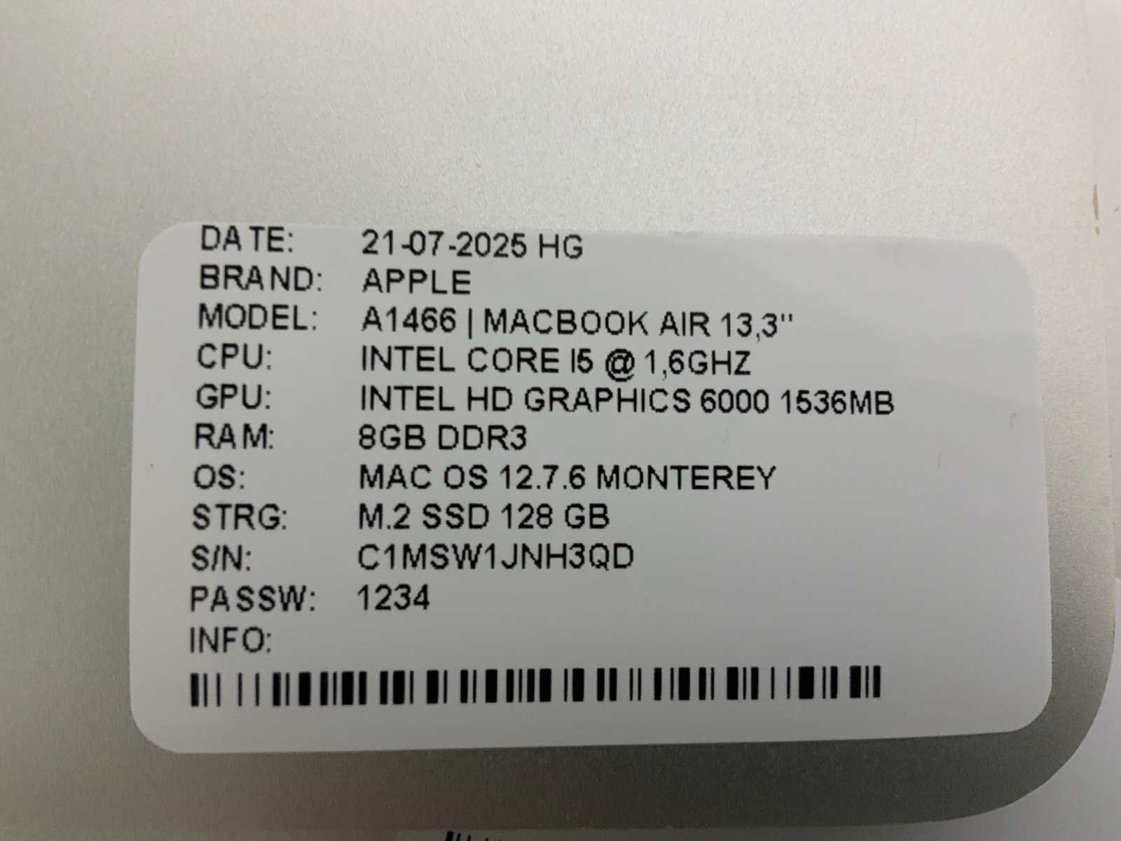 Merk: Apple Type: MACBook Air A1466 Processor type: Intel core i5 Processorsnelheid Ghz: 1,6 RAM Geheugen: 8GB RAM Geheugen Type: DDR3 Totale opslagcapaciteit: 128GB Type datadrager: M.2 NVMe Aantal datadragers: 1 Type videokaart: Intel HD Graphics 6000 Besturingssysteem: Monterey Zonder adapter: true Beelddiagonaal: 13'' Wifi: true Bluetooth: true USB-Type: USB-A USB poorten: 2 Card reader: true Thunderbolt: true Koptelefoon aansluiting: true Webcam: true Toetsenbord: QWERTY