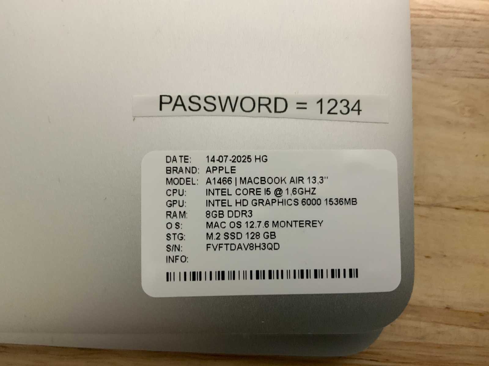 Merk: Apple Type: MACBook Air A1466 Processor type: Intel core i5 Processorsnelheid Ghz: 1,6 RAM Geheugen: 8GB RAM Geheugen Type: DDR3 Totale opslagcapaciteit: 128GB Type datadrager: M.2 NVMe Aantal datadragers: 1 Type videokaart: Intel HD Graphics 6000 Besturingssysteem: Monterey Zonder adapter: true Beelddiagonaal: 13'' Wifi: true Bluetooth: true USB-Type: USB-A USB poorten: 2 Card reader: true Thunderbolt: true Koptelefoon aansluiting: true Webcam: true Toetsenbord: QWERTY