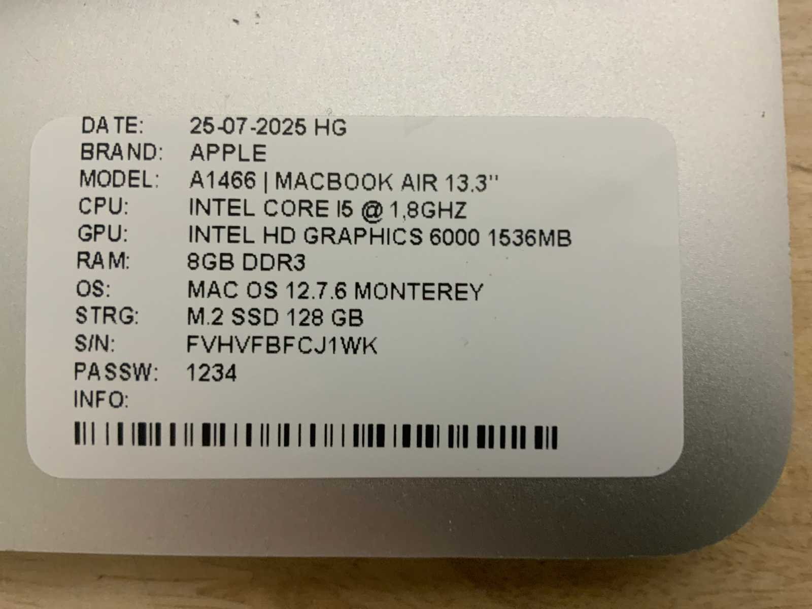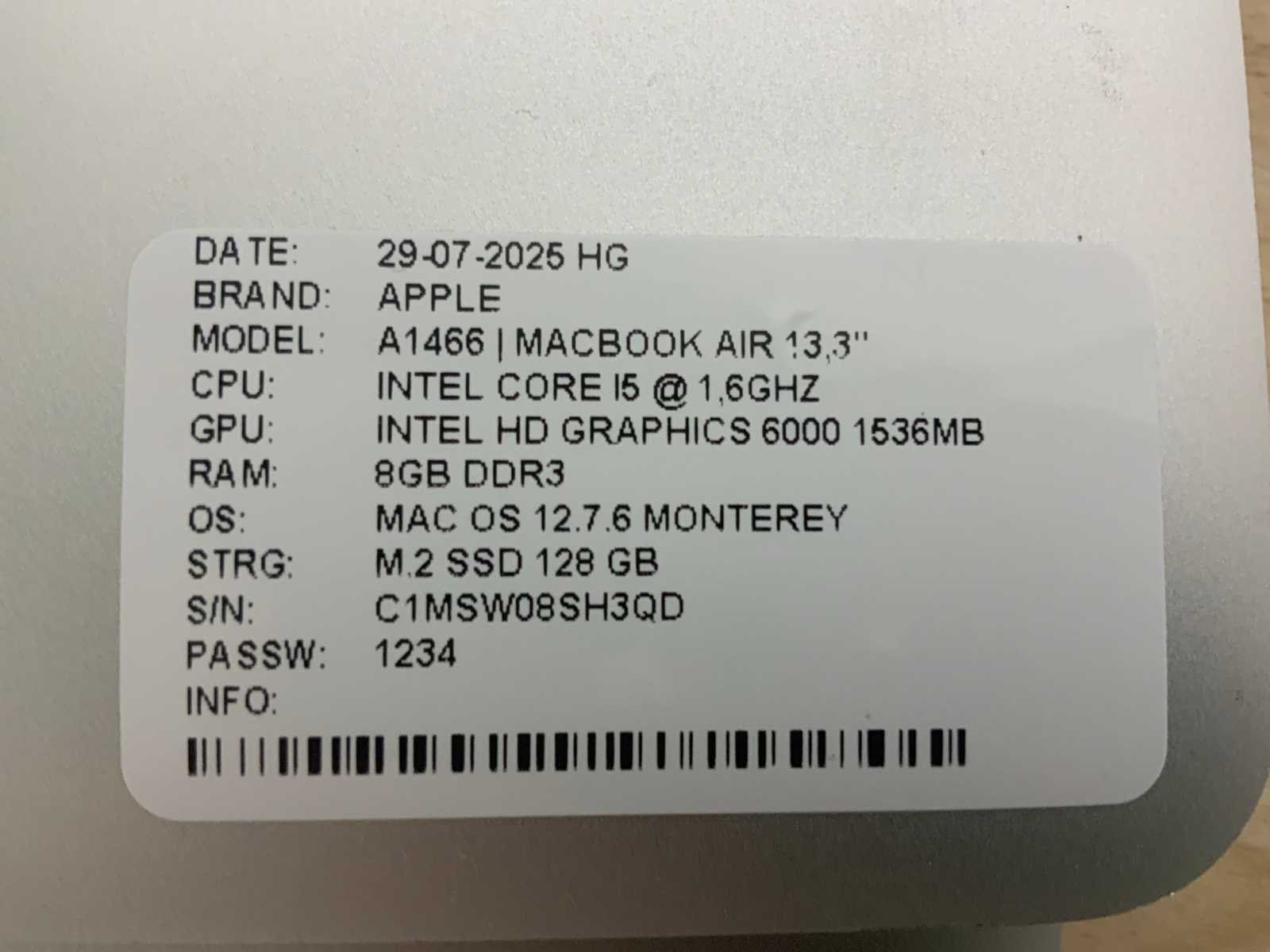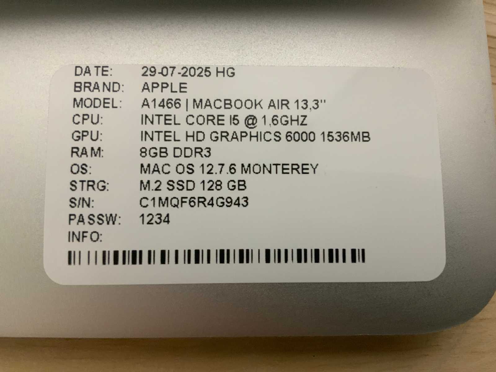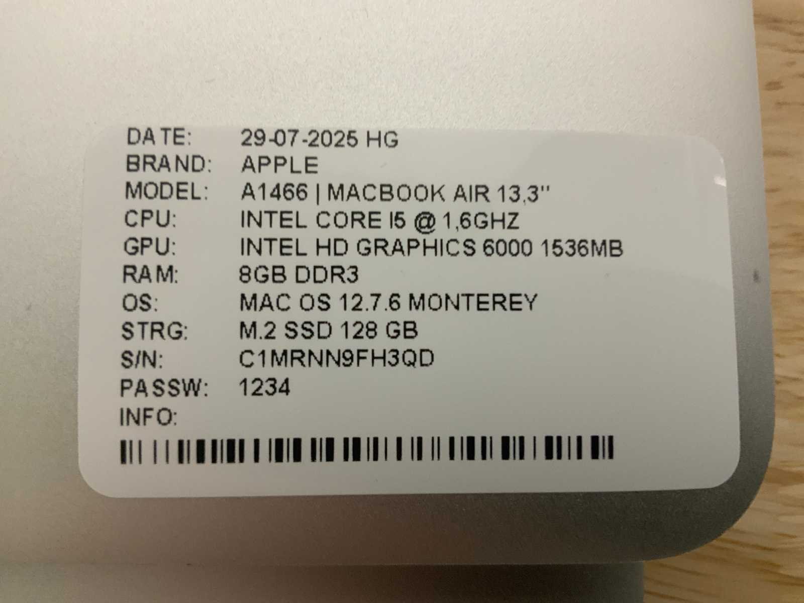Merk: Apple Type: MACBook Air A1466 Processor type: Intel core i5 RAM Geheugen: 8GB RAM Geheugen Type: DDR3 Totale opslagcapaciteit: 128GB Type datadrager: M.2 NVMe Aantal datadragers: 1 Type videokaart: Intel HD Graphics 6000 Besturingssysteem: Monterey Zonder adapter: true Beelddiagonaal: 13'' Wifi: true Bluetooth: true USB-Type: USB-A USB poorten: 2 Card reader: true Thunderbolt: true Koptelefoon aansluiting: true Webcam: true Toetsenbord: QWERTY