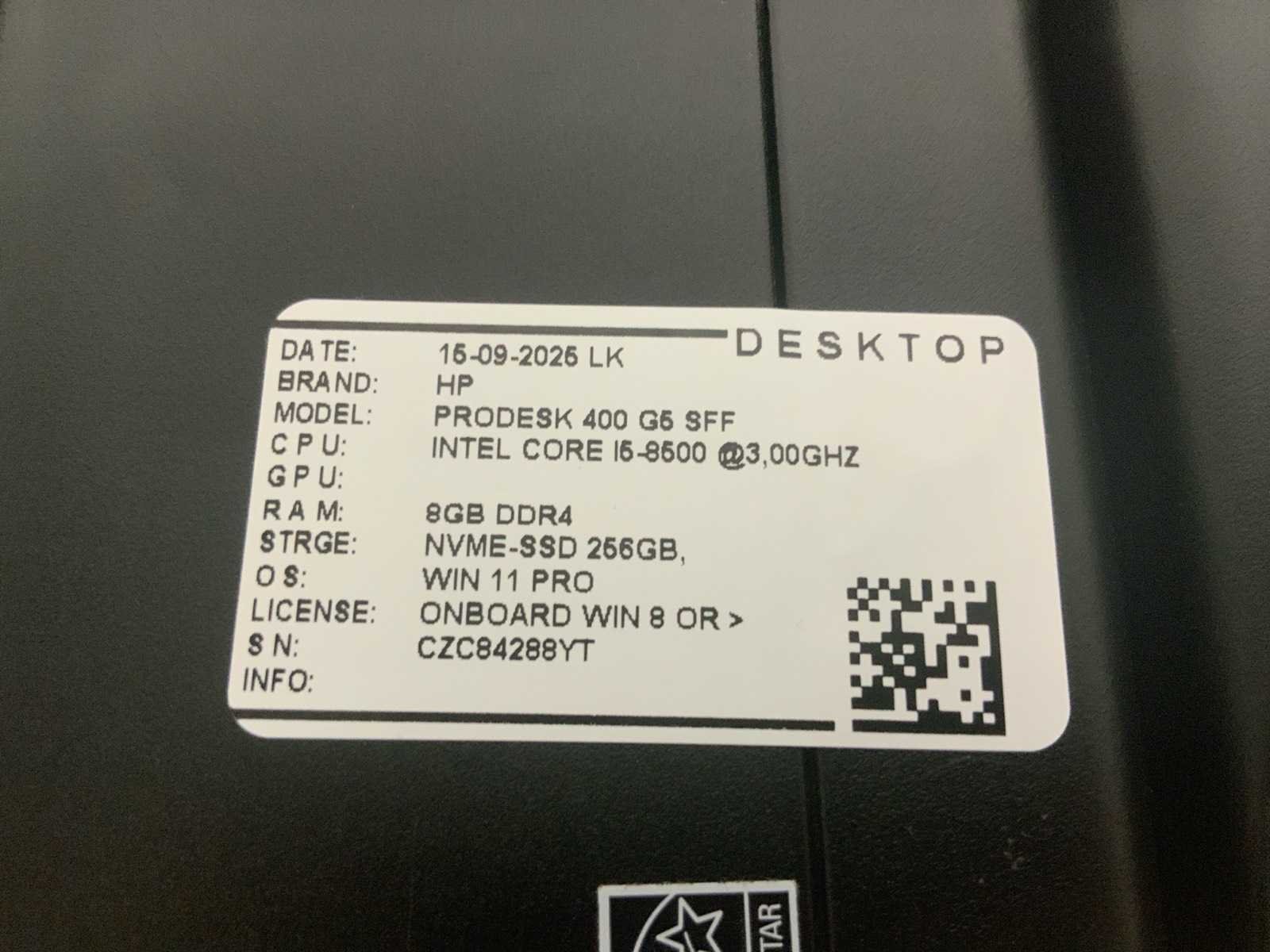 Merk: Hp Type: Prodesk 400 G5 Processor type: Intel core i5-8500 Processor snelheid: 3Ghz Besturingssysteem: Windows 11 Pro Type datadrager: M.2 SSD RAM Geheugen: 8GB RAM Geheugen Type: DDR4 Opslagcapaciteit: 256GB Displaypoort: 1 VGA: 1 Ethernet: 1 USB poorten: 8 Met voedingskabel: true Met adapter: true