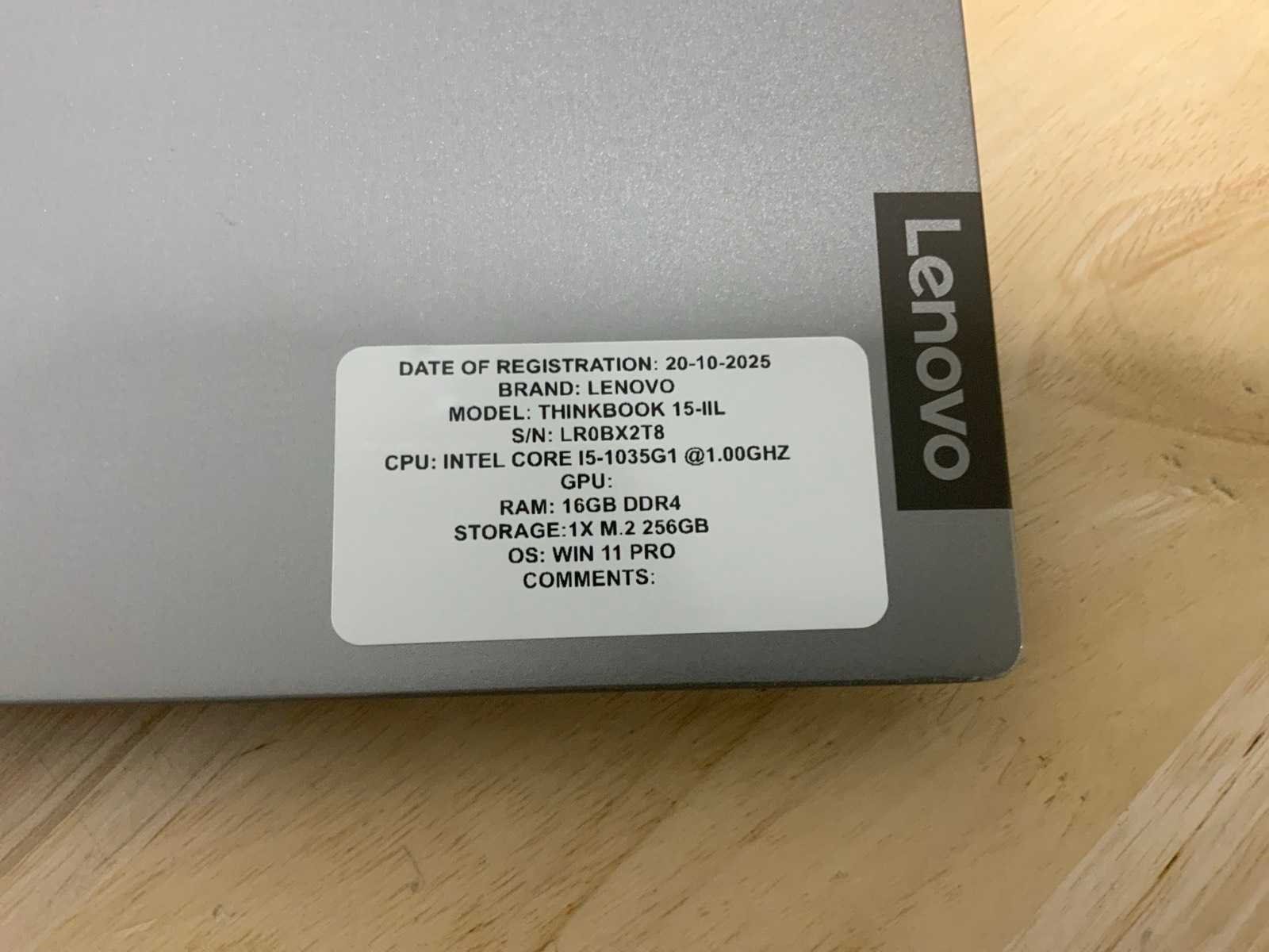 Merk: Lenovo Type: Thinkbook 15 G2 IIL Processor type: Intel core i5-1035G1 Processorsnelheid Ghz: 1,00 RAM Geheugen: 16GB RAM Geheugen Type: Ddr4 Totale opslagcapaciteit: 256GB Type datadrager: M-sata Besturingssysteem: Windows 11 pro Licentie: Onboard Zonder adapter: true Wifi: true USB-Type: Usb-C/Usb-A USB poorten: 4 Card reader: true Koptelefoon aansluiting: true Webcam: true Toetsenbord: Qwerty HDMI: 1