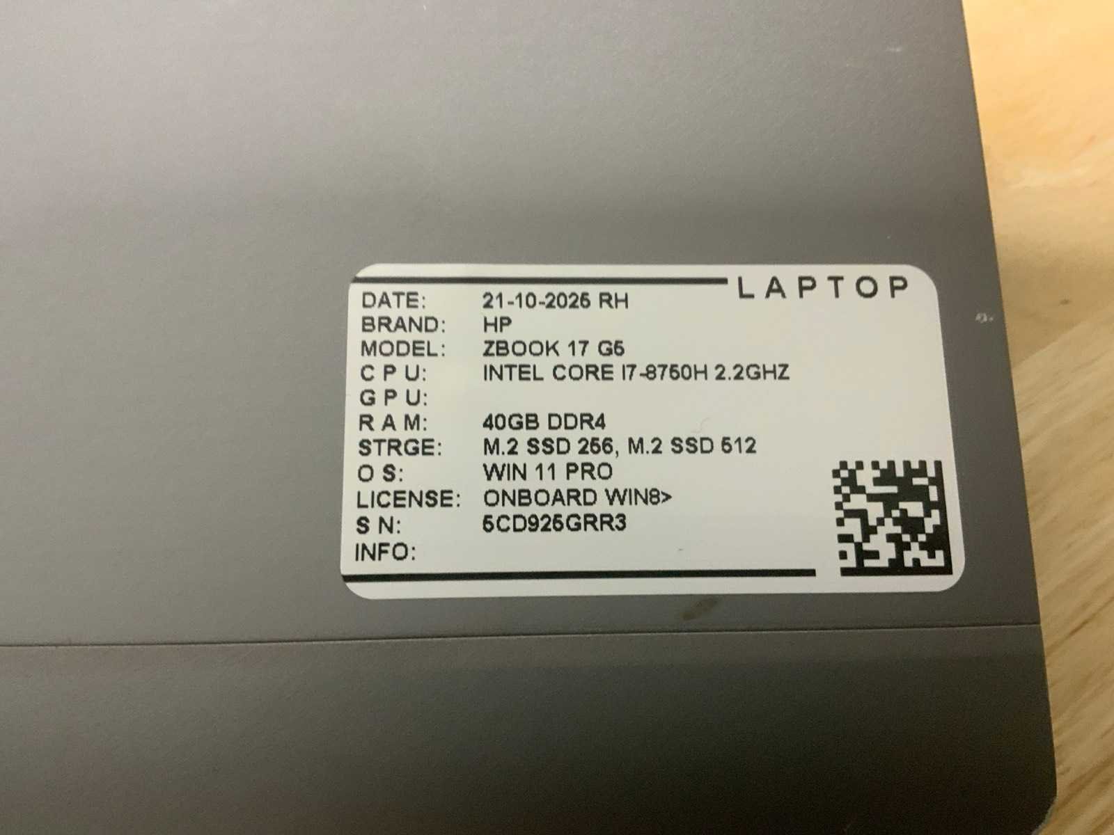 Merk: HP Type: Zbook 17 G5 (i7) Processor type: Intel core i7 -8750H Processorsnelheid Ghz: 2,20 RAM Geheugen: 40GB RAM Geheugen Type: Ddr4 Totale opslagcapaciteit: 768GB Type datadrager: M-sata/HDD Aantal datadragers: 2 Type videokaart: Nvidia quadro p2000 Besturingssysteem: Win 11 pro Licentie: Onboard Zonder adapter: true Touchscreen: true Beelddiagonaal: 17'' Wifi: true Bluetooth: true Ethernet: 1 USB-Type: Usb-A/Usb-C USB poorten: 5 Card reader: true Koptelefoon aansluiting: true Webcam: true Toetsenbord: Qwerty HDMI: 1 VGA: 1