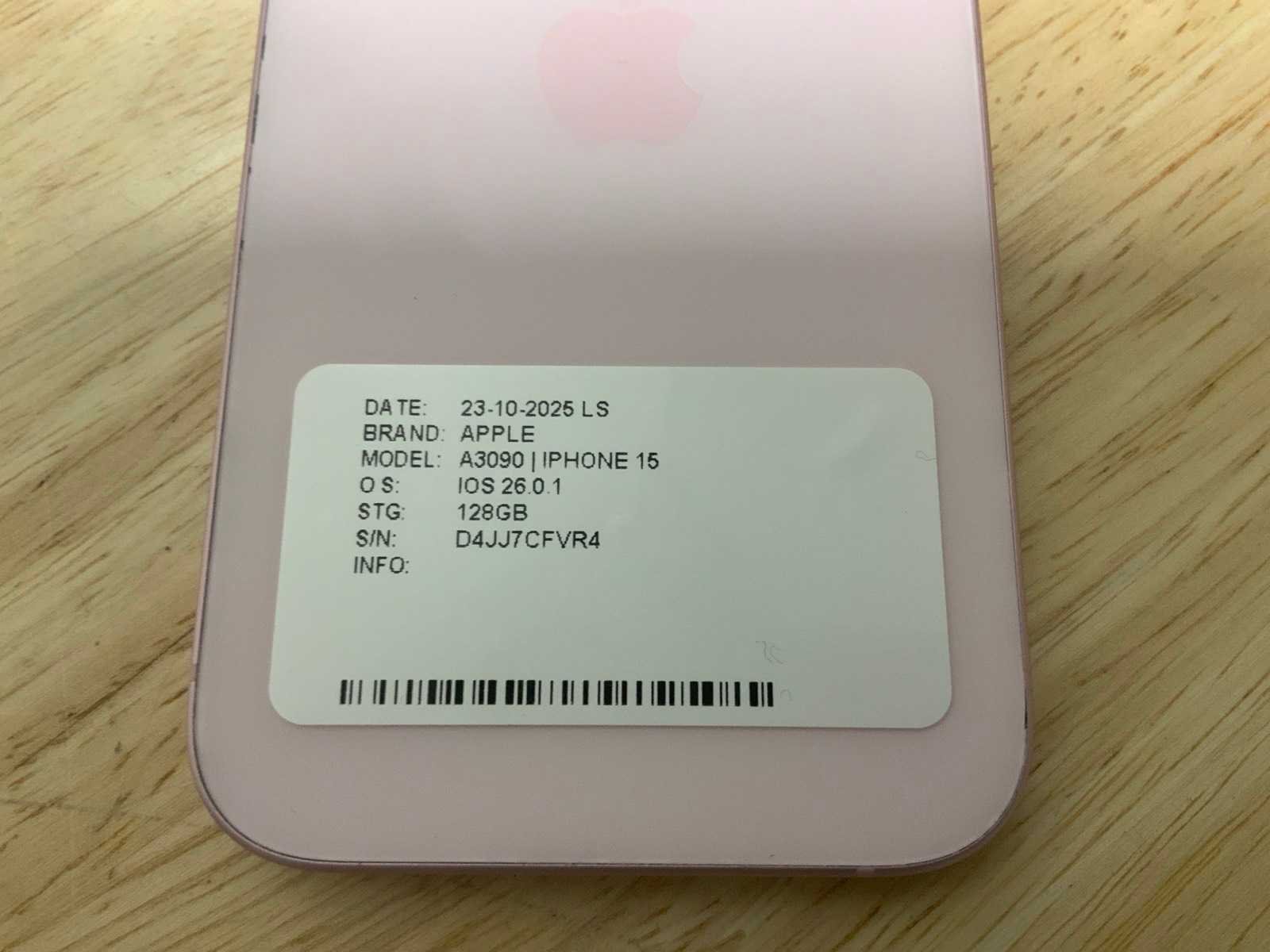Merk: Apple Type: iPhone 15 A3090 Draadloos opladen: true Quick charge functie: true Wifi: true Bluetooth: true Gezichtsherkenning: true Frontcamera: true Camera: true Touchscreen: true Simlock vrij: true Opslagcapaciteit: 128GB Besturingssysteem: IOS 26.0.1 Zonder oplader: true Refurbished: true