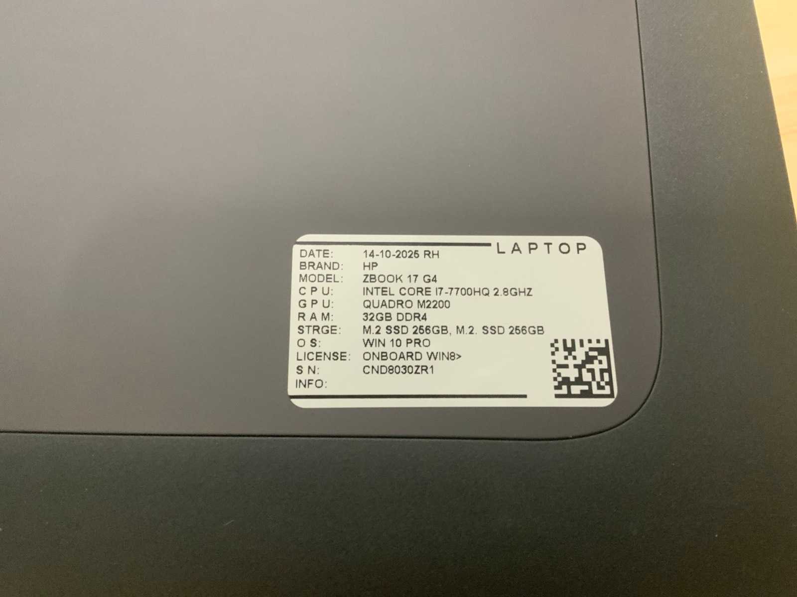 Merk: HP Type: Zbook 17 G4 (i7) Processor type: Intel core i7 -7700HQ Processorsnelheid Ghz: 2,8 RAM Geheugen: 32GB RAM Geheugen Type: Ddr4 Totale opslagcapaciteit: 512GB Type datadrager: M-sata/HDD Aantal datadragers: 2 Type videokaart: Nvidia quadro m2200 Besturingssysteem: Win 11 pro Licentie: Onboard Zonder adapter: true Touchscreen: true Beelddiagonaal: 17'' Wifi: true Bluetooth: true Ethernet: 1 USB-Type: Usb-A/Usb-C USB poorten: 6 Card reader: true Koptelefoon aansluiting: true Webcam: true Toetsenbord: Qwerty HDMI: 1 VGA: 1