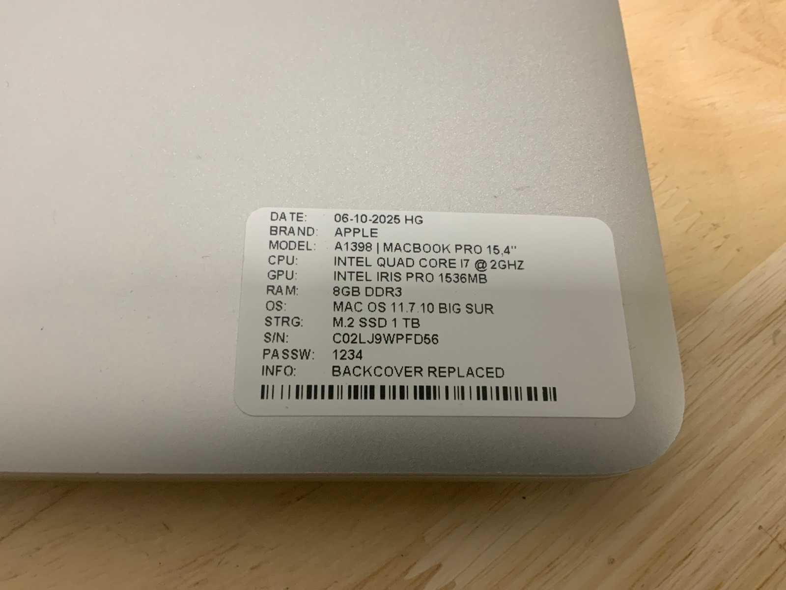 Merk: Apple Type: MacBook Pro A1398 Processor type: Intel core i7 Processorsnelheid Ghz: 2.00 RAM Geheugen: 8GB RAM Geheugen Type: DDR3 Totale opslagcapaciteit: 1000GB Type datadrager: M.2 SSD Aantal datadragers: 1 Type videokaart: Intel iris pro Besturingssysteem: Big sur Zonder adapter: true Beelddiagonaal: 15.4'' Wifi: true Bluetooth: true USB-Type: USB-A USB poorten: 2 Thunderbolt: true Koptelefoon aansluiting: true Webcam: true Toetsenbord: QWERTY Refurbished: true HDMI: 1