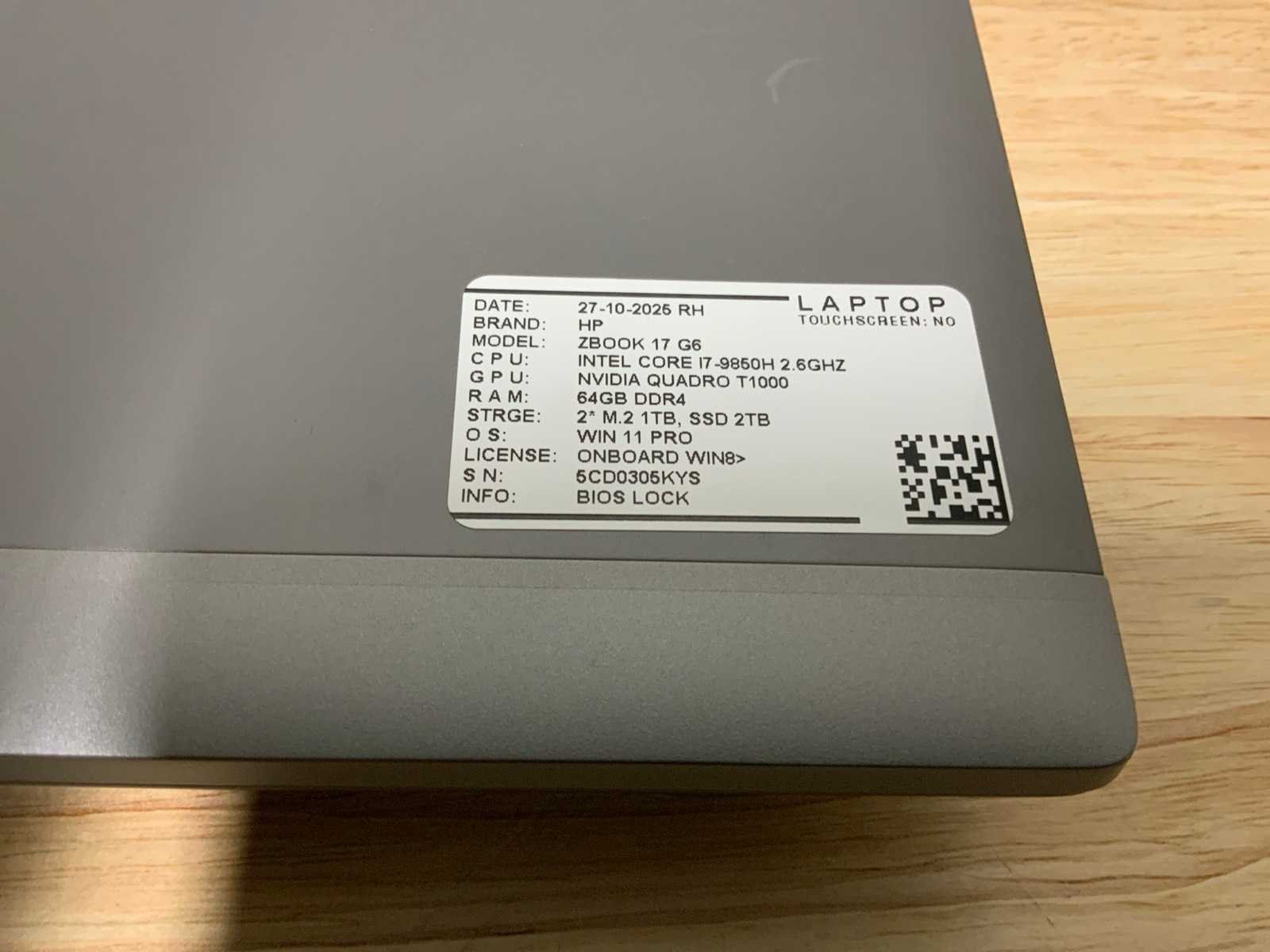 Merk: Hp Type: ZBook 17 G6 Processor type: Intel core i7-9850H Processorsnelheid Ghz: 2,6 RAM Geheugen: 64GB RAM Geheugen Type: DDR4 Totale opslagcapaciteit: 3000GB Type datadrager: M.2 SSD Aantal datadragers: 2 Type videokaart: Nvidia Quadro T1000 Besturingssysteem: Windows 11 Pro Licentie: Onboard Zonder adapter: true Beelddiagonaal: 17'' Wifi: true Bluetooth: true Ethernet: 1 USB-Type: USB-A & USB-C USB poorten: 5 Card reader: true Koptelefoon aansluiting: true Webcam: true Toetsenbord: QWERTzy HDMI: 1 Displaypoort: 1