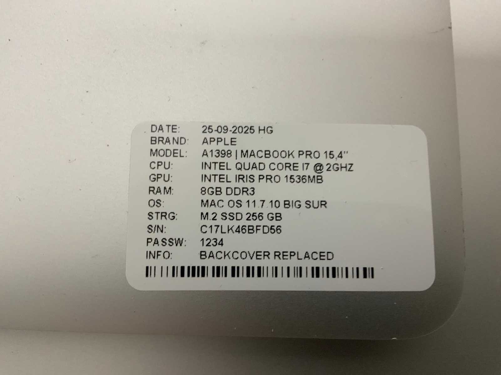 Merk: Apple Type: MACBOOK Pro A1398(i7) Processor type: Intel core i7 Processorsnelheid Ghz: 2.00 RAM Geheugen: 8GB RAM Geheugen Type: DDR3 Totale opslagcapaciteit: 256GB Type datadrager: Apple ssd Aantal datadragers: 1 Type videokaart: Intel iris pro graphics Besturingssysteem: Big sur Licentie: Nvt Zonder adapter: true Beelddiagonaal: 15'' Wifi: true USB-Type: USB-A USB poorten: 2 Thunderbolt: true Koptelefoon aansluiting: true Webcam: true Toetsenbord: Qwerty HDMI: 1