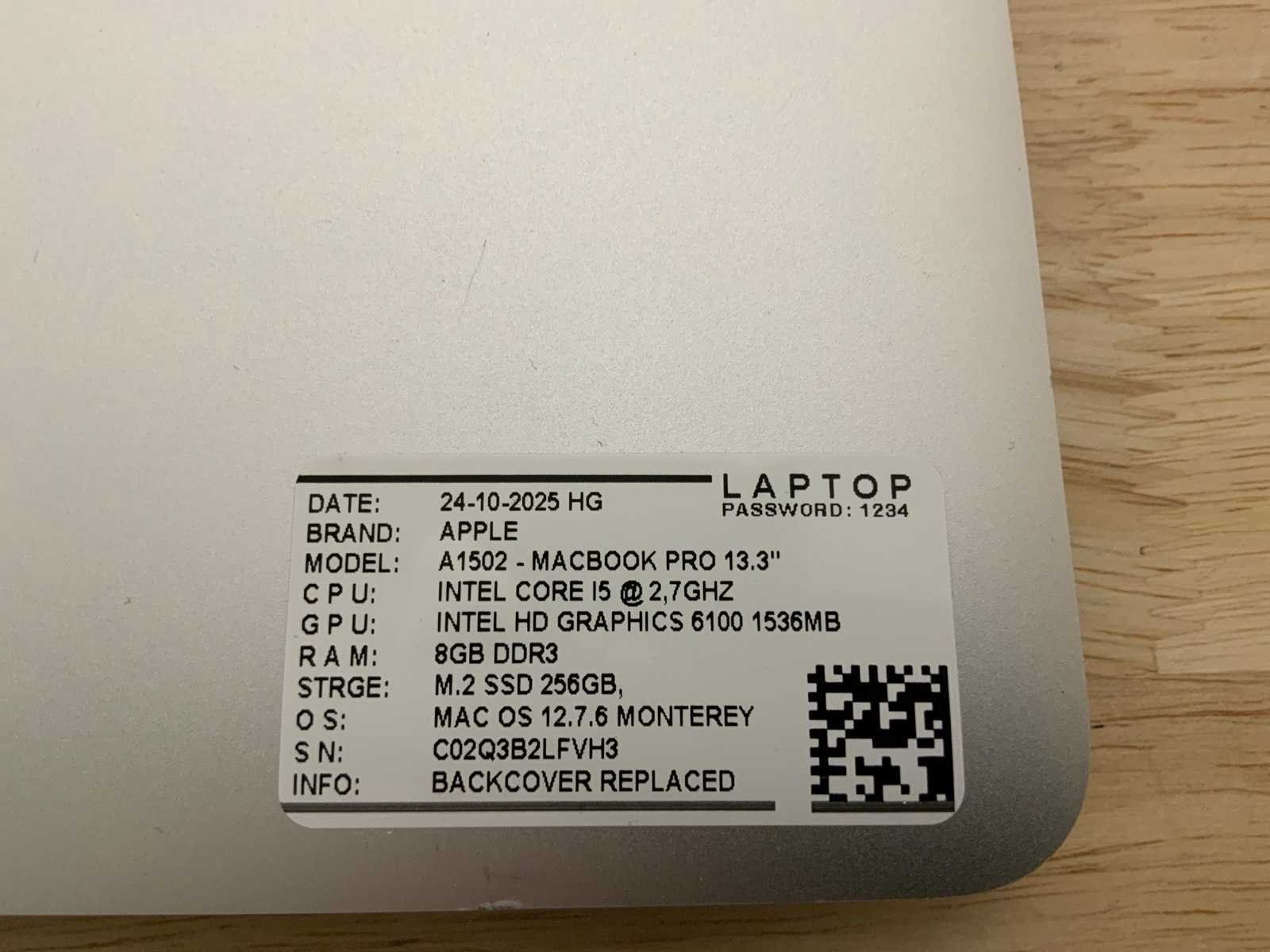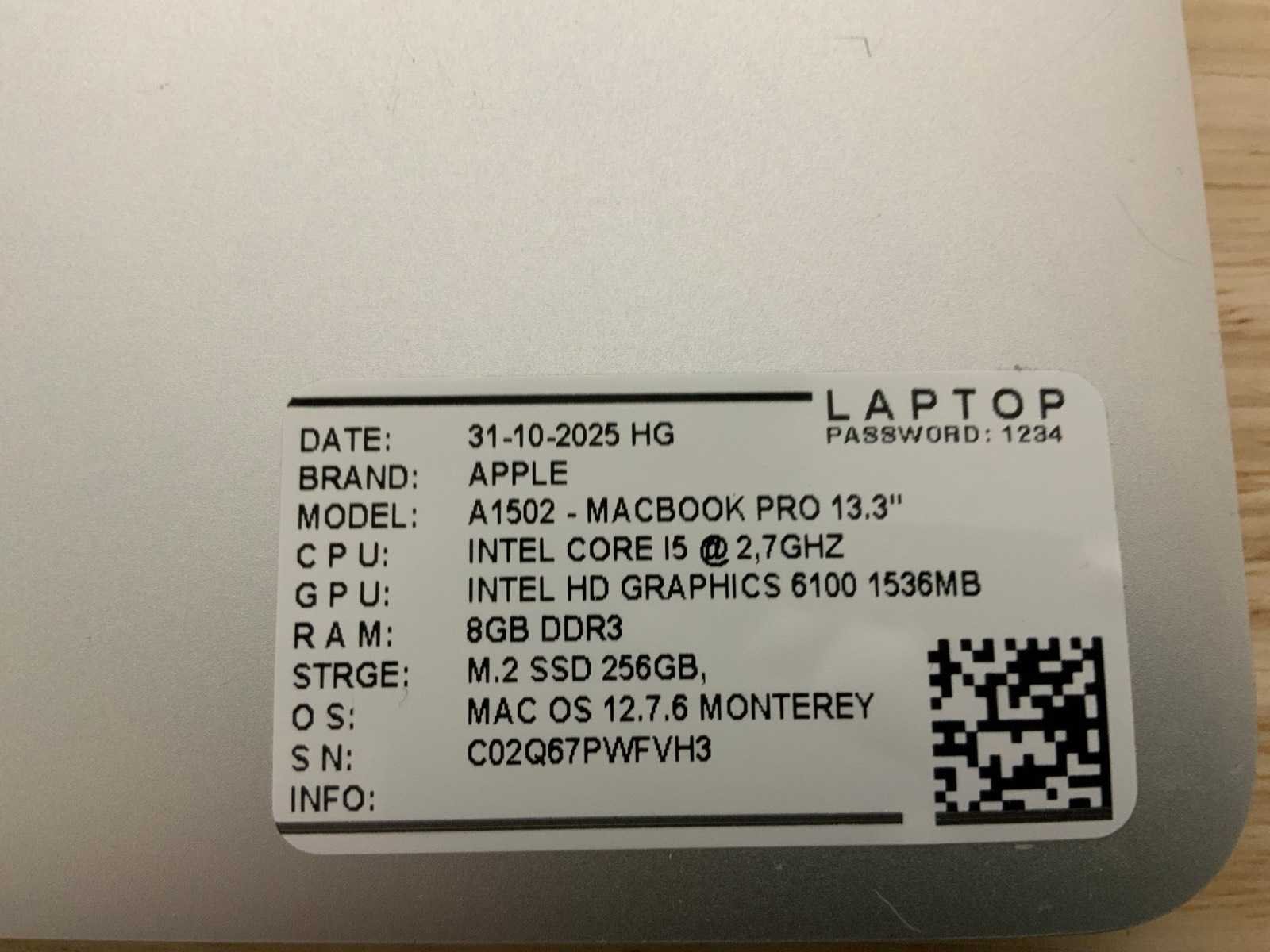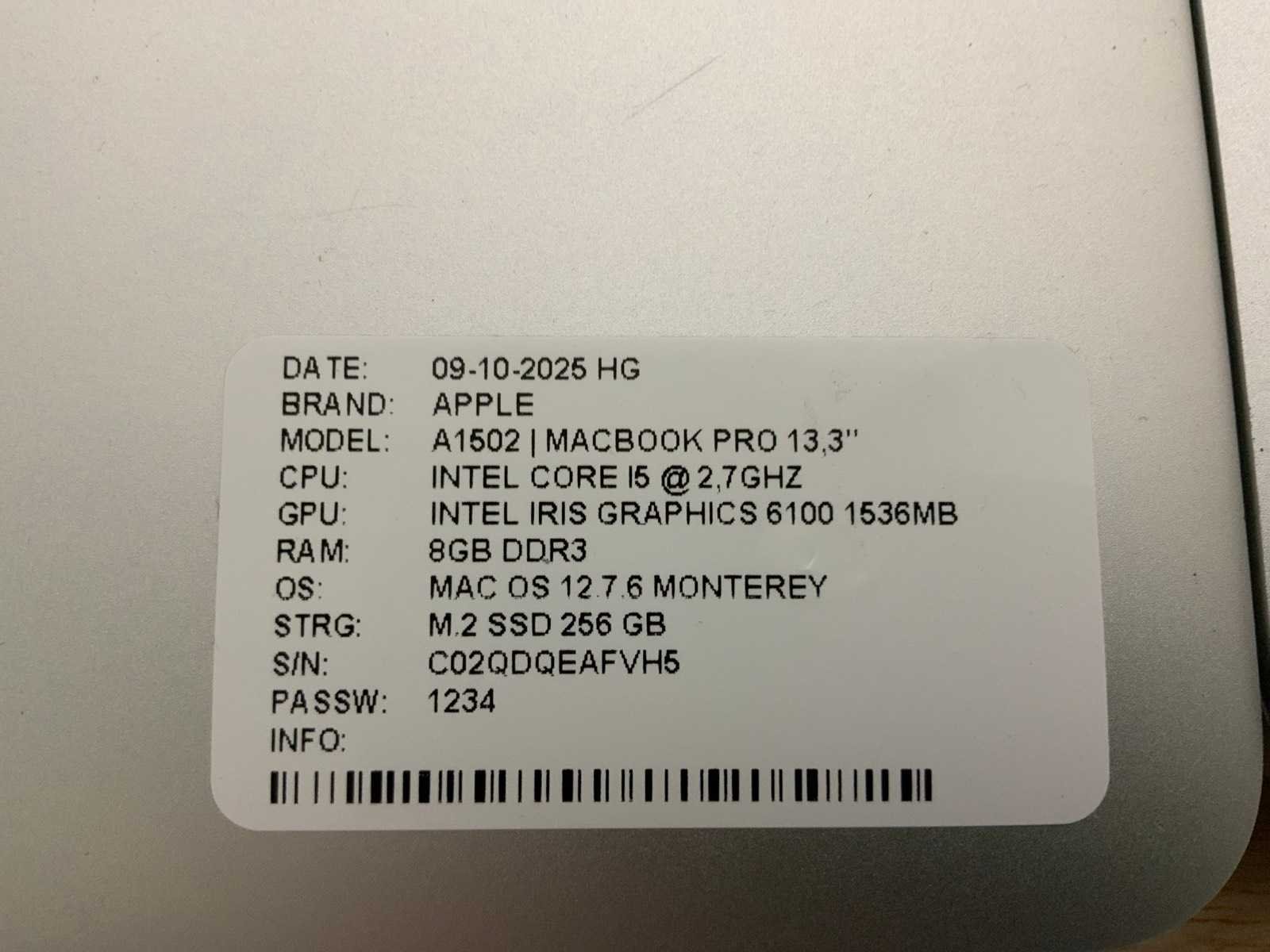 Merk: Apple Type: MACBook Pro A1502 Processor type: Intel core i5 Processorsnelheid Ghz: 2,70 RAM Geheugen: 8GB RAM Geheugen Type: DDR3 Totale opslagcapaciteit: 256GB Type datadrager: SSD Aantal datadragers: 1 Type videokaart: Intel Iris Graphics Besturingssysteem: Monterey Licentie: Nvt Zonder adapter: true Beelddiagonaal: 13'' Wifi: true Bluetooth: true USB-Type: USB-A USB poorten: 2 Thunderbolt: true HDMI: 1