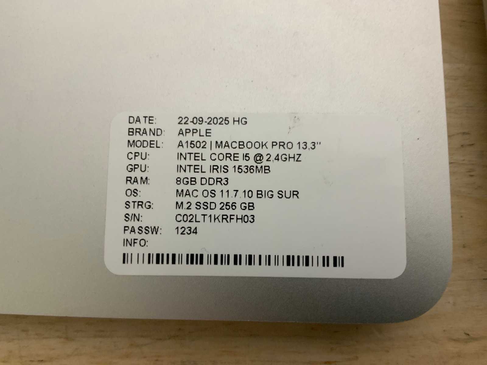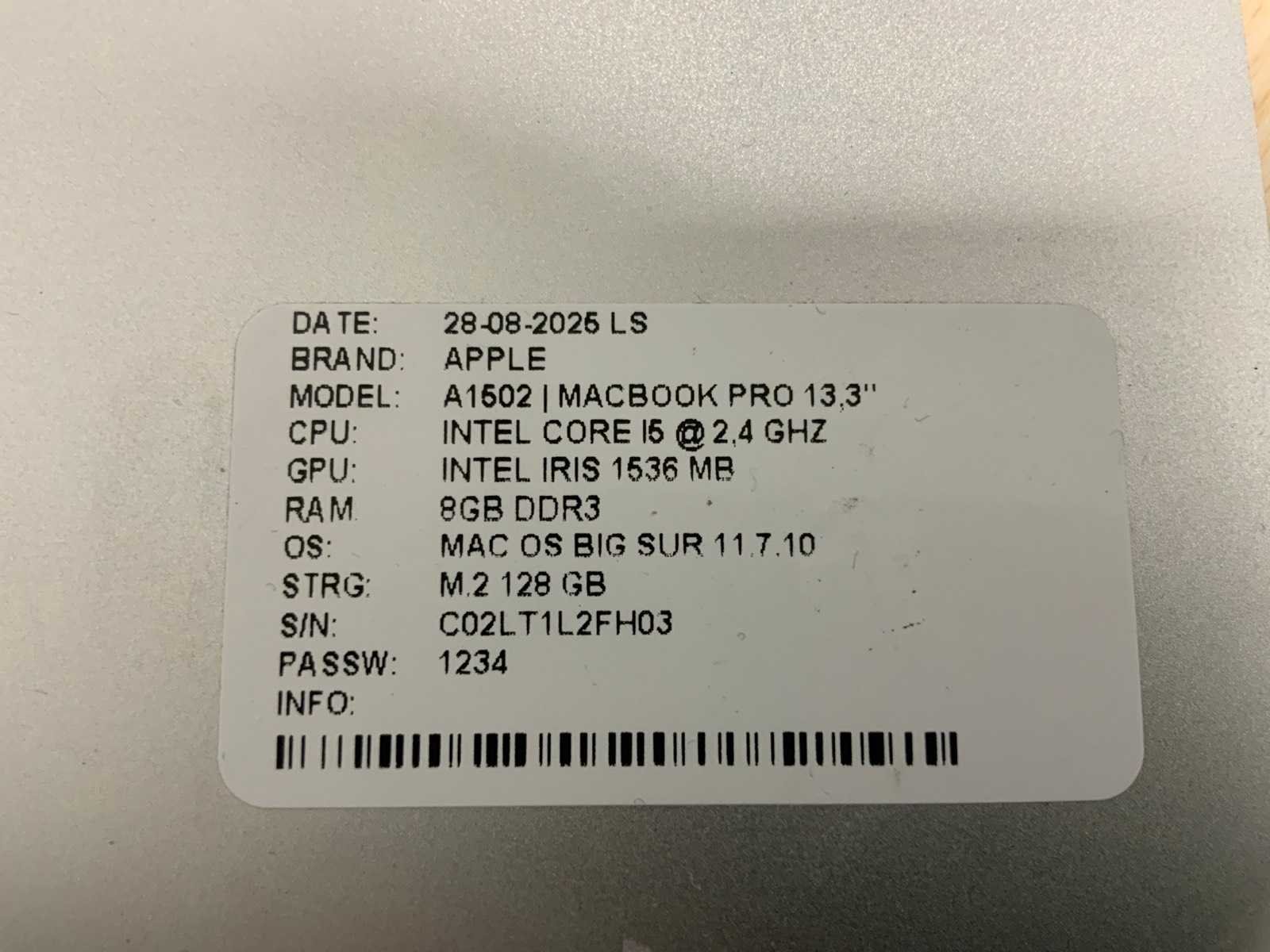 Merk: Apple Type: MACBook Pro A1502 Processor type: Intel core i5 Processorsnelheid Ghz: 2,40 RAM Geheugen Type: DDR3 Type datadrager: SSD Aantal datadragers: 1 Type videokaart: Intel Iris Graphics Besturingssysteem: Big sur Licentie: Nvt Zonder adapter: true Beelddiagonaal: 13'' Wifi: true Bluetooth: true USB-Type: USB-A USB poorten: 2 Thunderbolt: true HDMI: 1