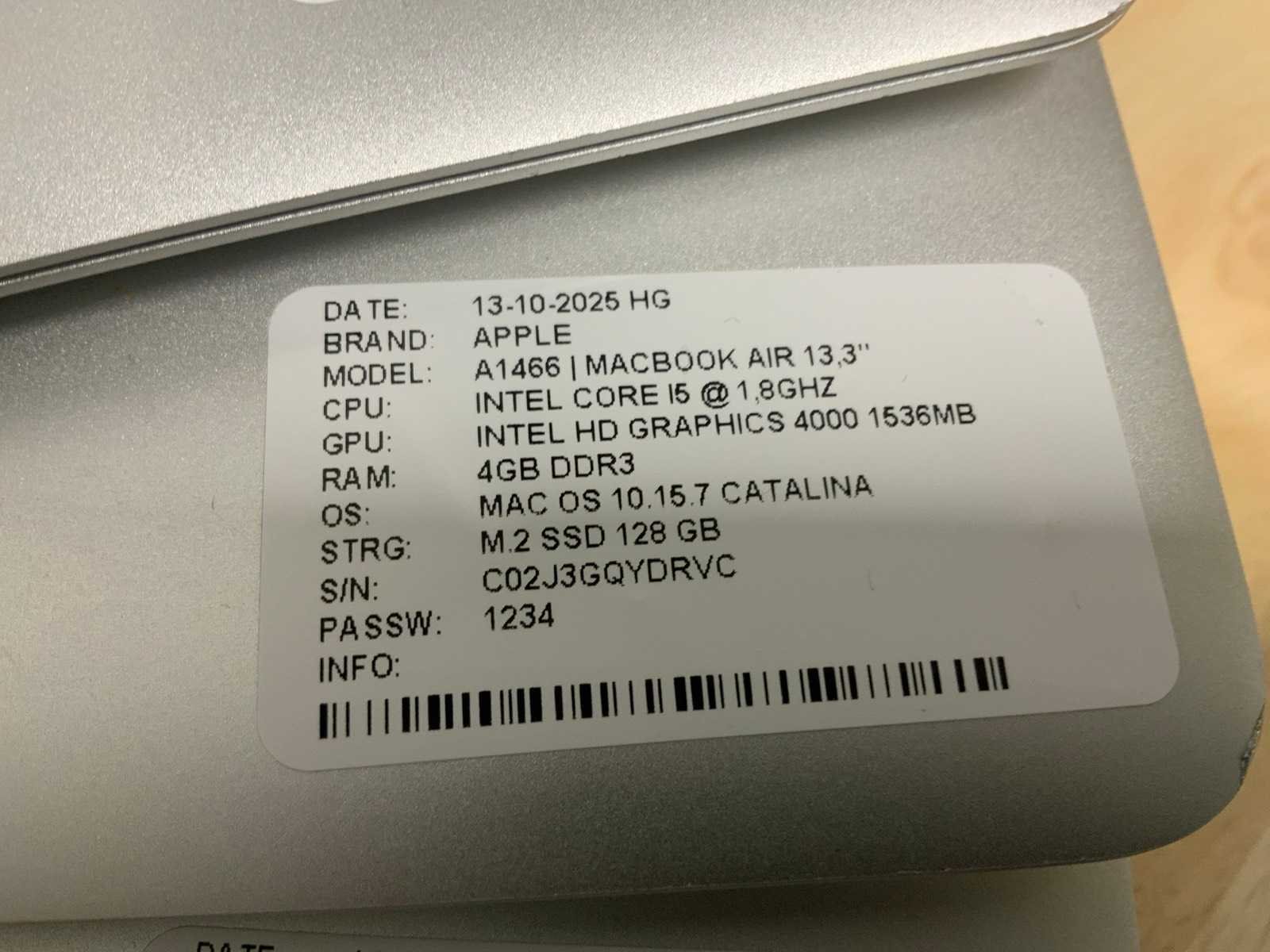 Merk: Apple Type: MACBook Air A1466 Processor type: Intel core i5 Processorsnelheid Ghz: 1,8 RAM Geheugen Type: DDR3 Totale opslagcapaciteit: 128GB Type datadrager: M.2 NVMe Aantal datadragers: 1 Type videokaart: Intel HD Graphics 4000 Besturingssysteem: CATALINA Zonder adapter: true Beelddiagonaal: 13'' Wifi: true Bluetooth: true USB-Type: USB-A USB poorten: 2 Card reader: true Thunderbolt: true Koptelefoon aansluiting: true Webcam: true Toetsenbord: QWERTY