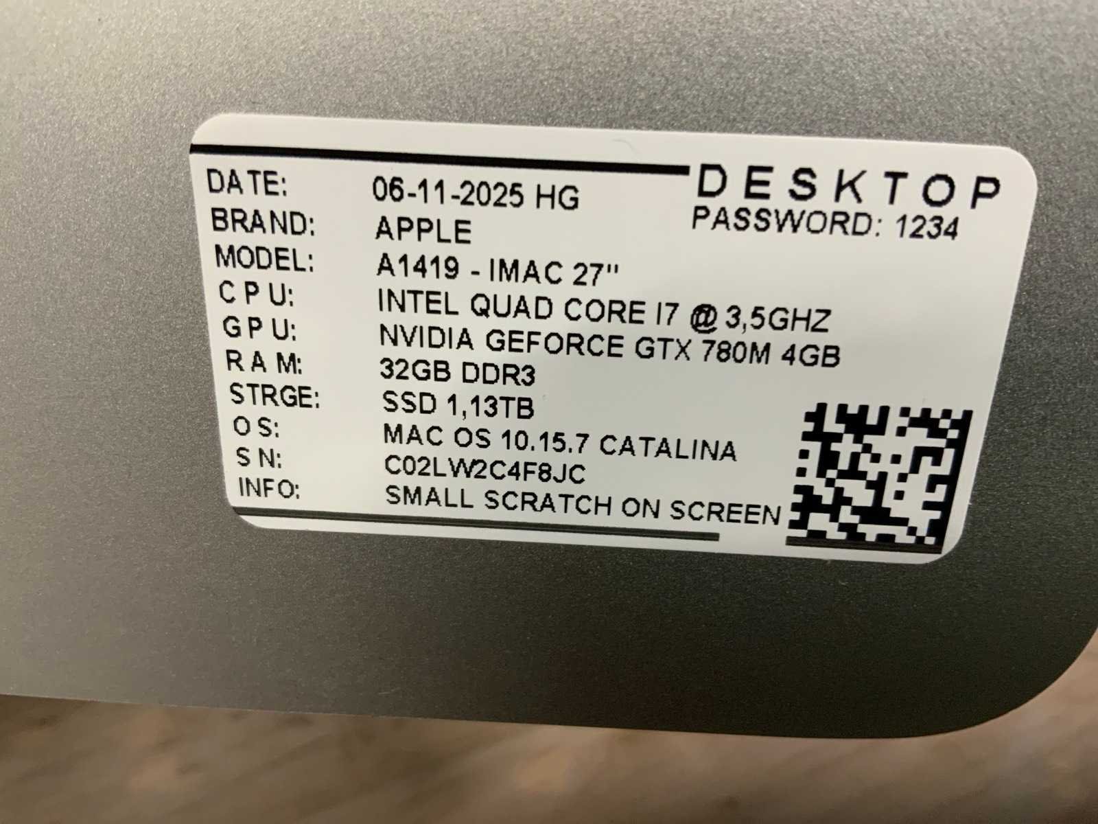 Merk: Apple Type: iMAC A1419 Processorsnelheid Ghz: 3,5 Besturingssysteem: Catalina Type datadrager: SSD’s RAM Geheugen: 32GB Opslagcapaciteit: 1000GB Type videokaart: Nvidia geforce gtx 780M Bluetooth: true Wifi: true Ethernet: 1 USB poorten: 4 Thunderbolt: true Met voedingskabel: true Beelddiagonaal: 27''