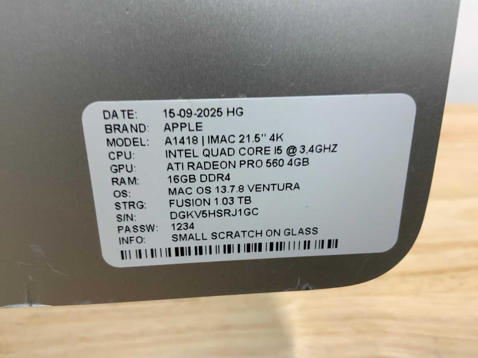Merk: Apple Type: iMAC A1418 Processor type: Intel core i5 Processorsnelheid Ghz: 3,40 Besturingssysteem: Monterey Type datadrager: Fusion RAM Geheugen: 16GB RAM Geheugen Type: DDR4 Opslagcapaciteit: 1030GB Type videokaart: Ati radeon pro 560 Bluetooth: true Wifi: true Ethernet: 1 USB poorten: 4 Zonder voedingskabel: true Beelddiagonaal: 21.5'' Resolutie: 4k