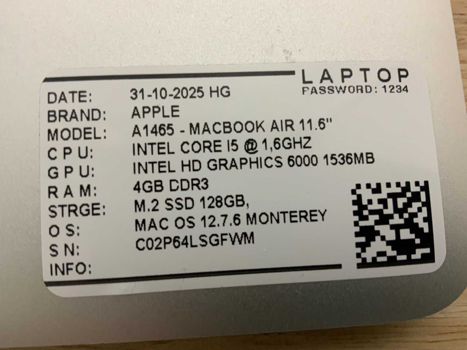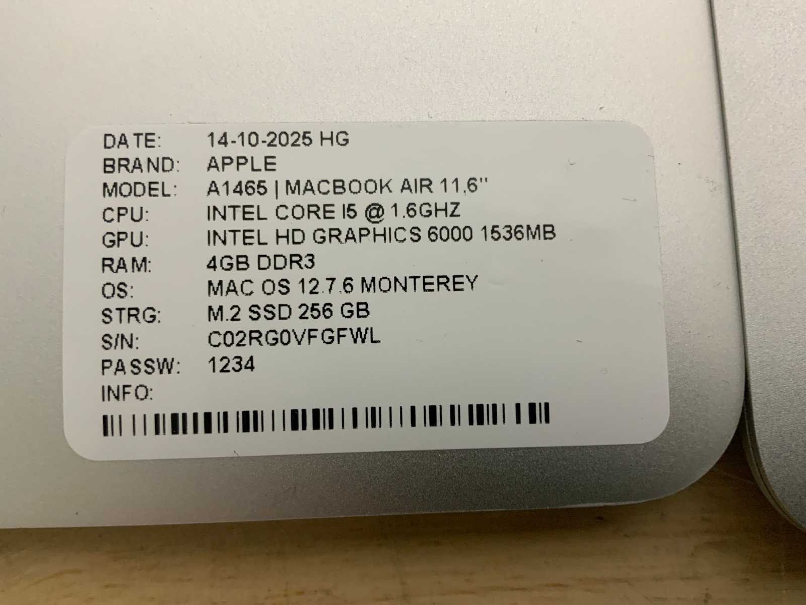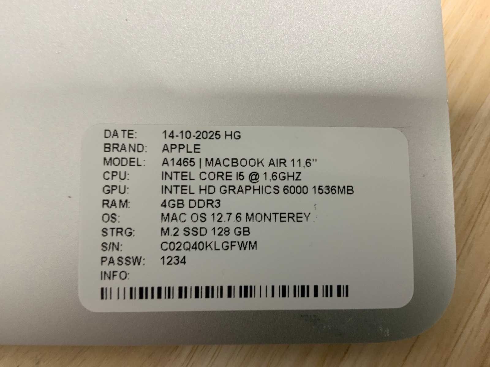 Merk: Apple Type: MACBook Air A1465 Processor type: Intel core i5 Processorsnelheid Ghz: 1,6 RAM Geheugen: 4GB RAM Geheugen Type: DDR3 Type datadrager: M.2 NVMe Aantal datadragers: 1 Type videokaart: Intel HD Graphics 6000 Besturingssysteem: Monterey Zonder adapter: true Beelddiagonaal: 11'' Wifi: true Bluetooth: true USB-Type: USB-A USB poorten: 2 Card reader: true Thunderbolt: true Koptelefoon aansluiting: true Webcam: true Toetsenbord: QWERTY