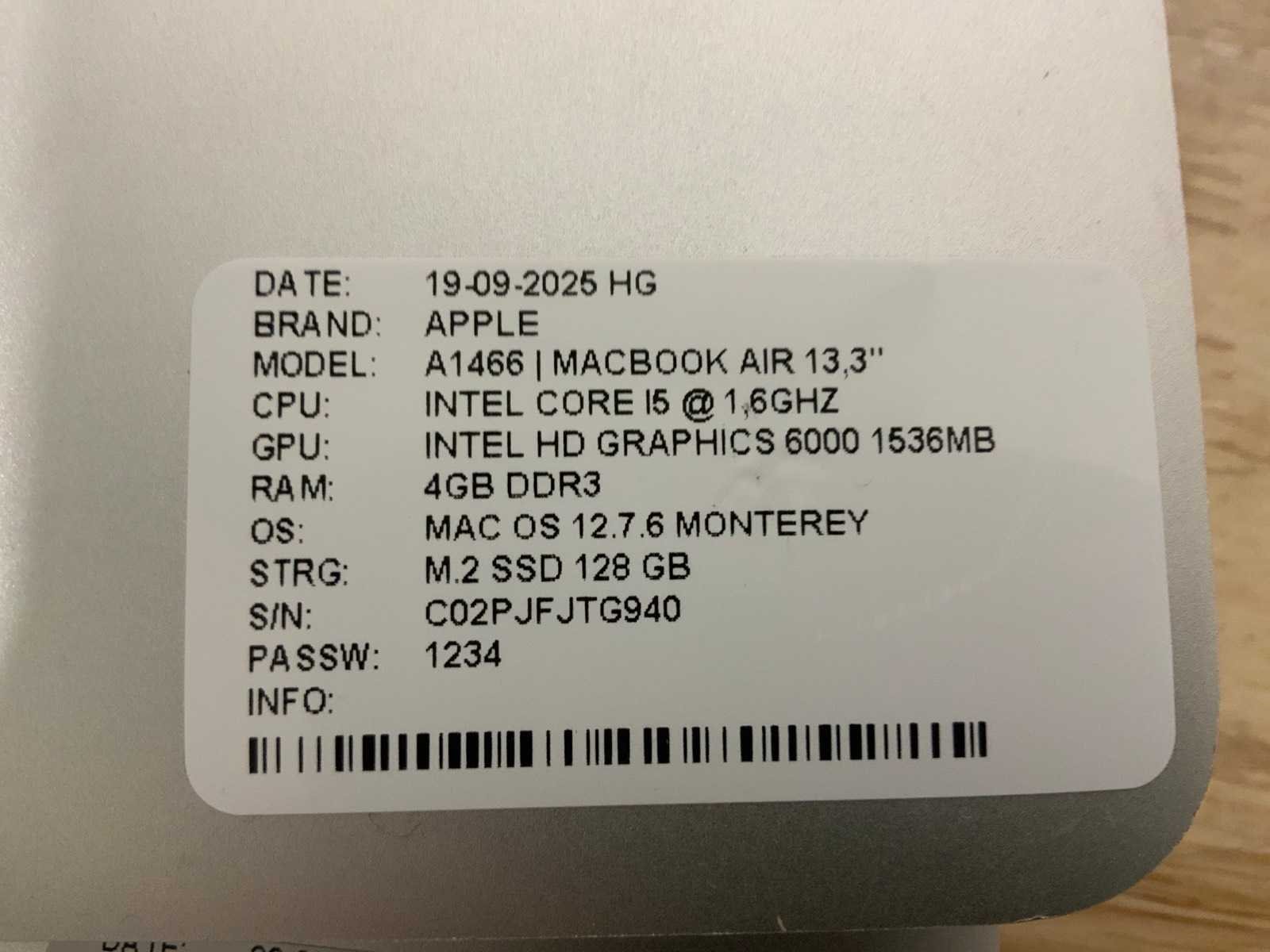 Merk: Apple Type: MACBook Air A1466 Processor type: Intel core i5 RAM Geheugen Type: DDR3 Totale opslagcapaciteit: 128GB Type datadrager: M.2 NVMe Aantal datadragers: 1 Type videokaart: Intel HD Graphics 6000 Besturingssysteem: Monterey Zonder adapter: true Beelddiagonaal: 13'' Wifi: true Bluetooth: true USB-Type: USB-A USB poorten: 2 Card reader: true Thunderbolt: true Koptelefoon aansluiting: true Webcam: true Toetsenbord: QWERTY