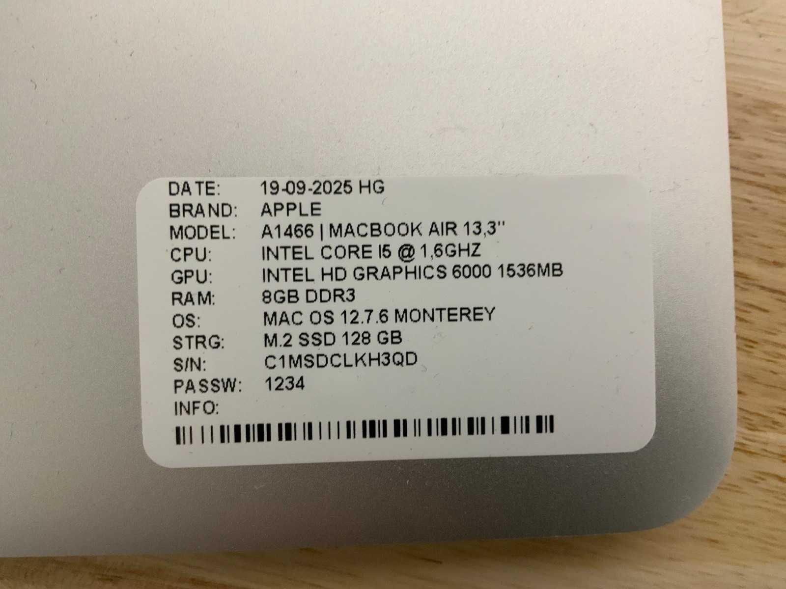 Merk: Apple Type: MACBook Air A1466 Processor type: Intel core i5 Processorsnelheid Ghz: 1,6 RAM Geheugen: 8GB RAM Geheugen Type: DDR3 Type datadrager: M.2 NVMe Aantal datadragers: 1 Type videokaart: Intel HD Graphics 6000 Besturingssysteem: Monterey Zonder adapter: true Beelddiagonaal: 13'' Wifi: true Bluetooth: true USB-Type: USB-A USB poorten: 2 Card reader: true Thunderbolt: true Koptelefoon aansluiting: true Webcam: true Toetsenbord: QWERTY
