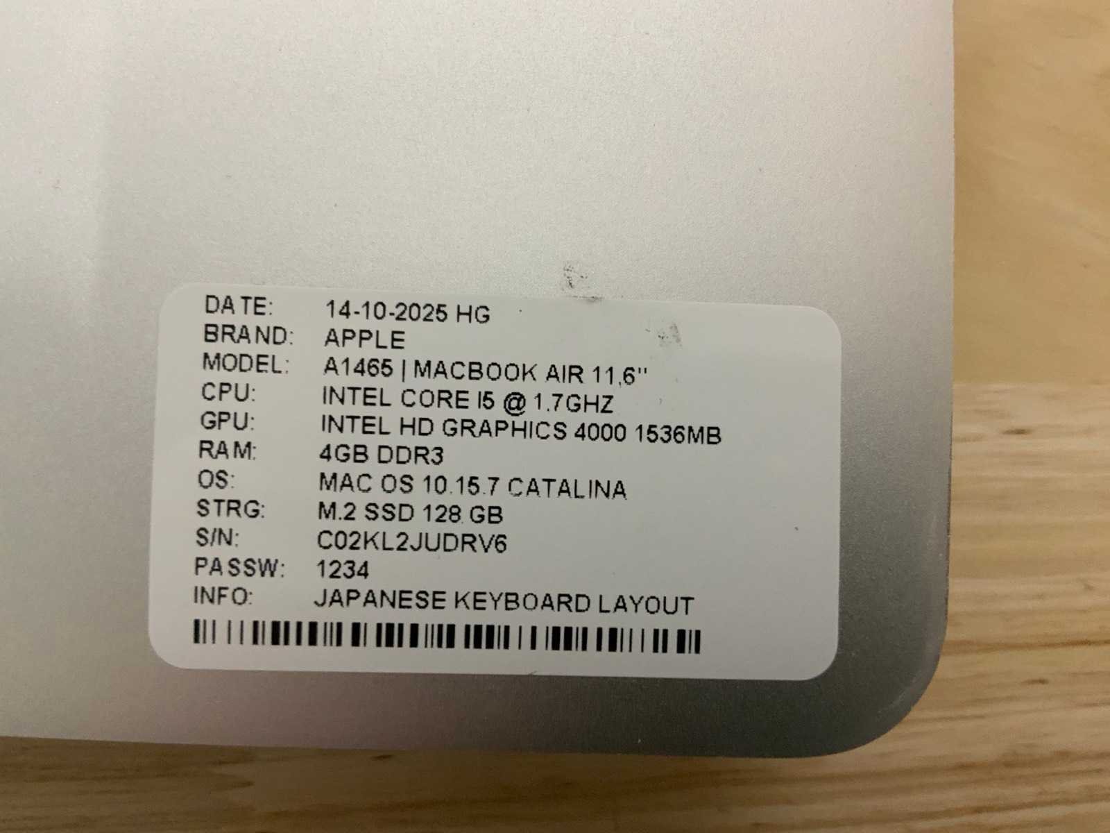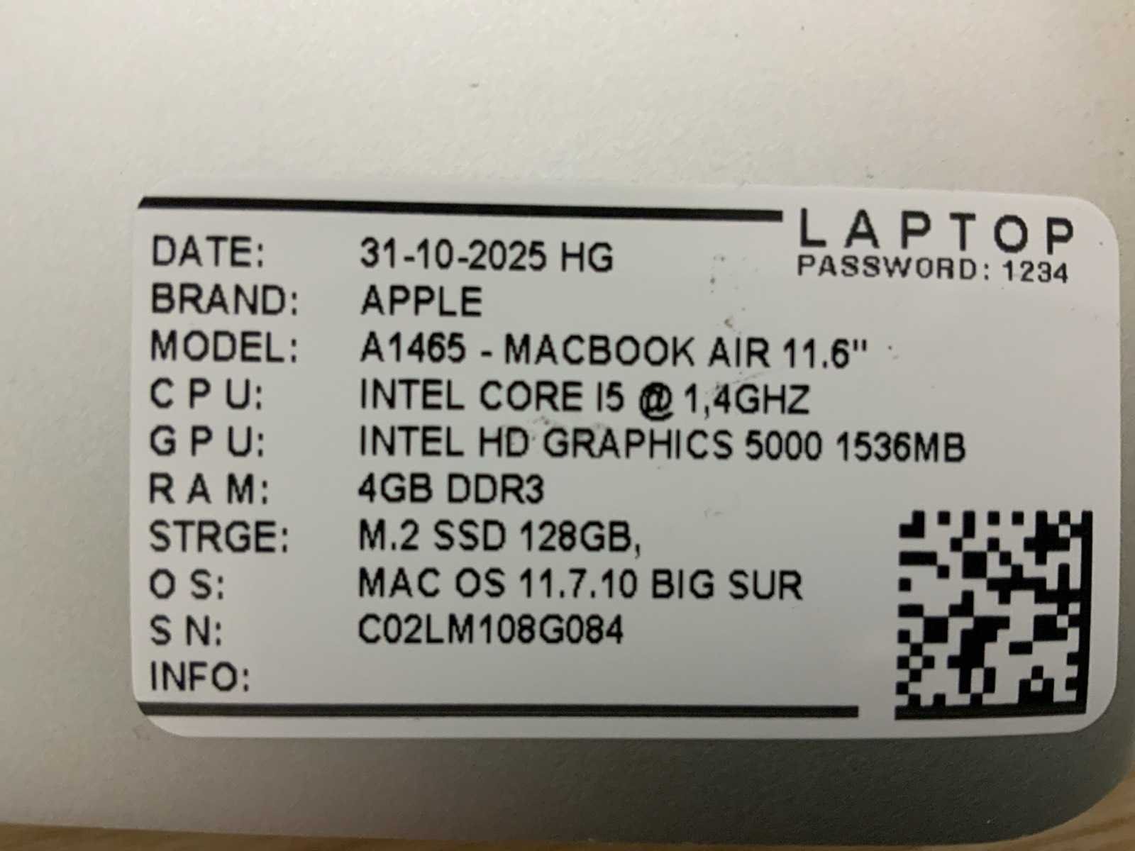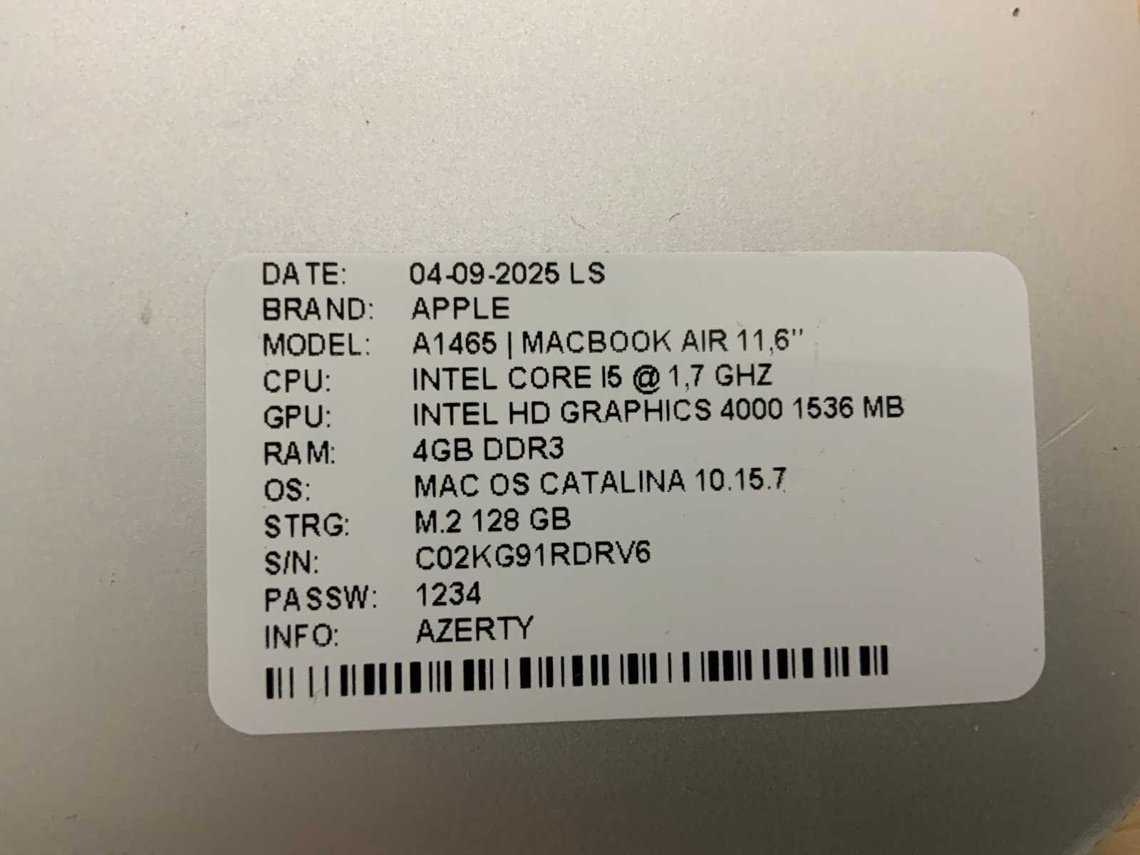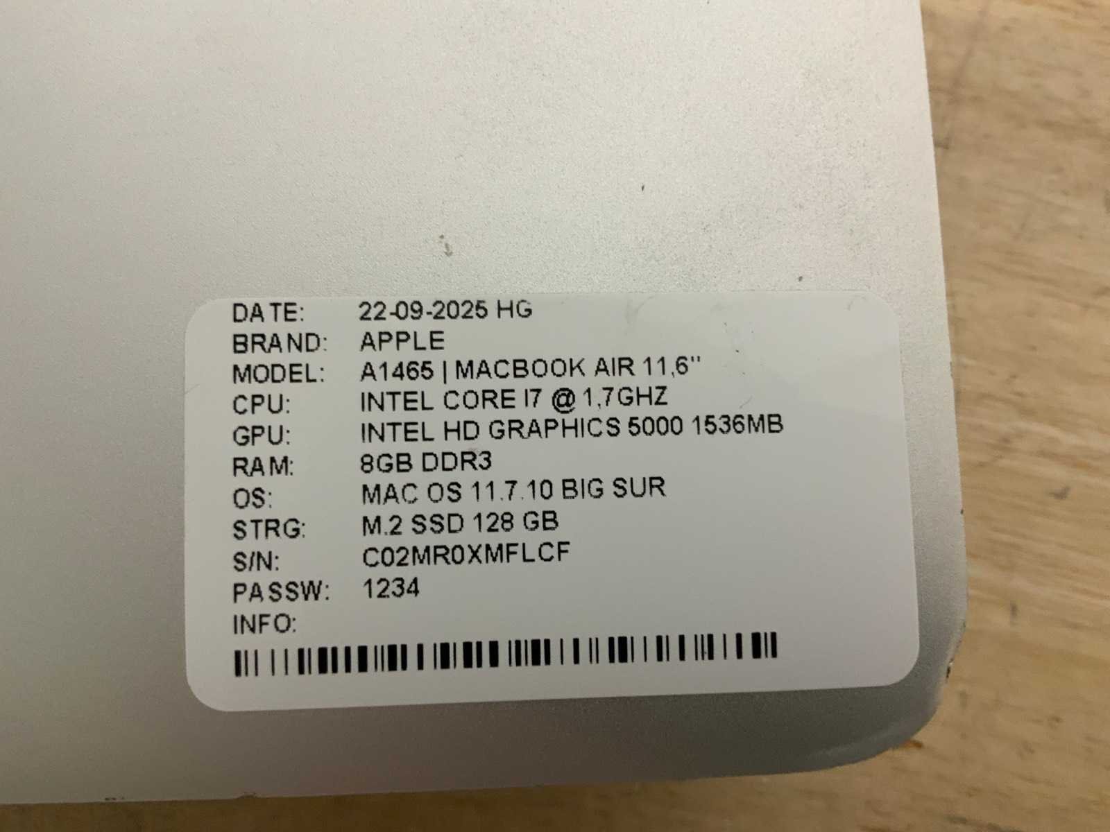 Merk: Apple Type: MACBook Air A1465 Processor type: Intel core i5 Processorsnelheid Ghz: 1,7/1,4 RAM Geheugen Type: DDR3 Type datadrager: M.2 NVMe Aantal datadragers: 1 Type videokaart: Intel HD Graphics 5000/4000 Besturingssysteem: Monterey Zonder adapter: true Beelddiagonaal: 11'' Wifi: true Bluetooth: true USB-Type: USB-A USB poorten: 2 Card reader: true Thunderbolt: true Koptelefoon aansluiting: true Webcam: true