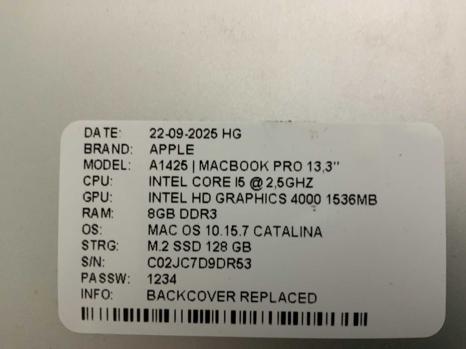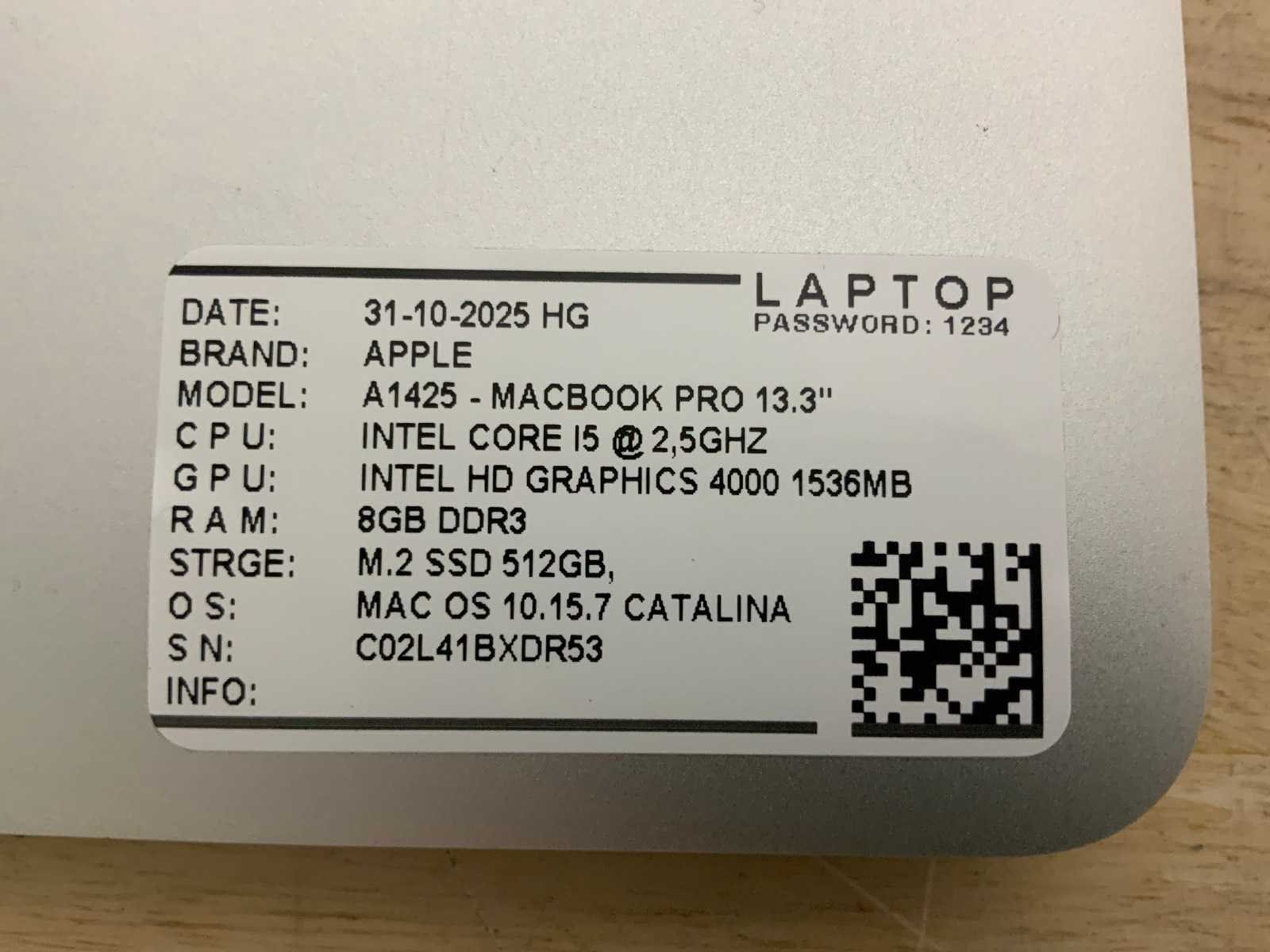 Merk: Apple Type: MACBook Pro A1502/A1425 Processor type: Intel core i5 Processorsnelheid Ghz: 1,4 RAM Geheugen: 8GB RAM Geheugen Type: DDR3 Type datadrager: SSD Aantal datadragers: 1 Type videokaart: Intel hd graphics 4000 Besturingssysteem: Catalina Licentie: Nvt Zonder adapter: true Beelddiagonaal: 13'' Wifi: true Bluetooth: true USB-Type: USB-A USB poorten: 2 Thunderbolt: true HDMI: 1