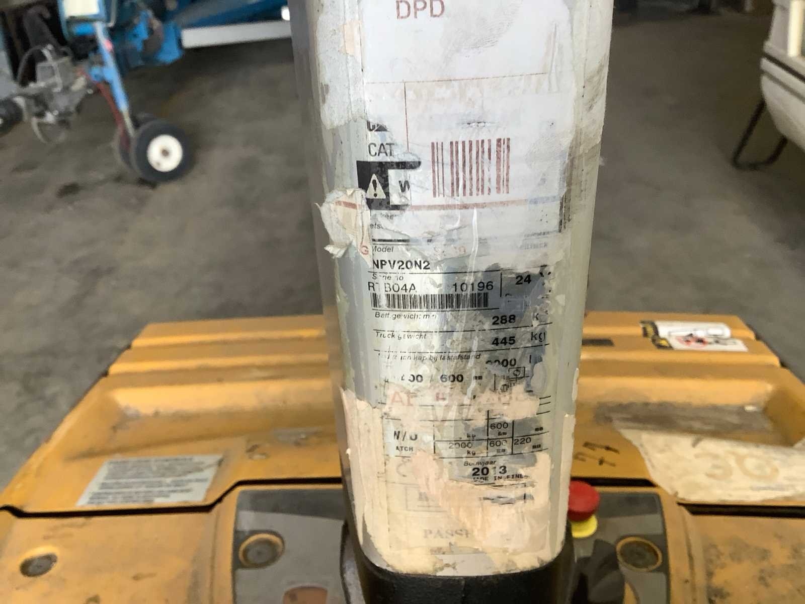 Op werking gestart Merk: Cat Type: npv20n2 Bouwjaar: 2013 Serienummer: 10196 Hefvermogen: 2000kg Lepellengte: 1100mm Meerij palletwagen: true Afgelezen urenstand: 4549 Eigen gewicht: 445kg Totale afmeting L: 2000mm Totale afmeting Breedte: 750mm Totale afmeting Hoogte: 1700mm