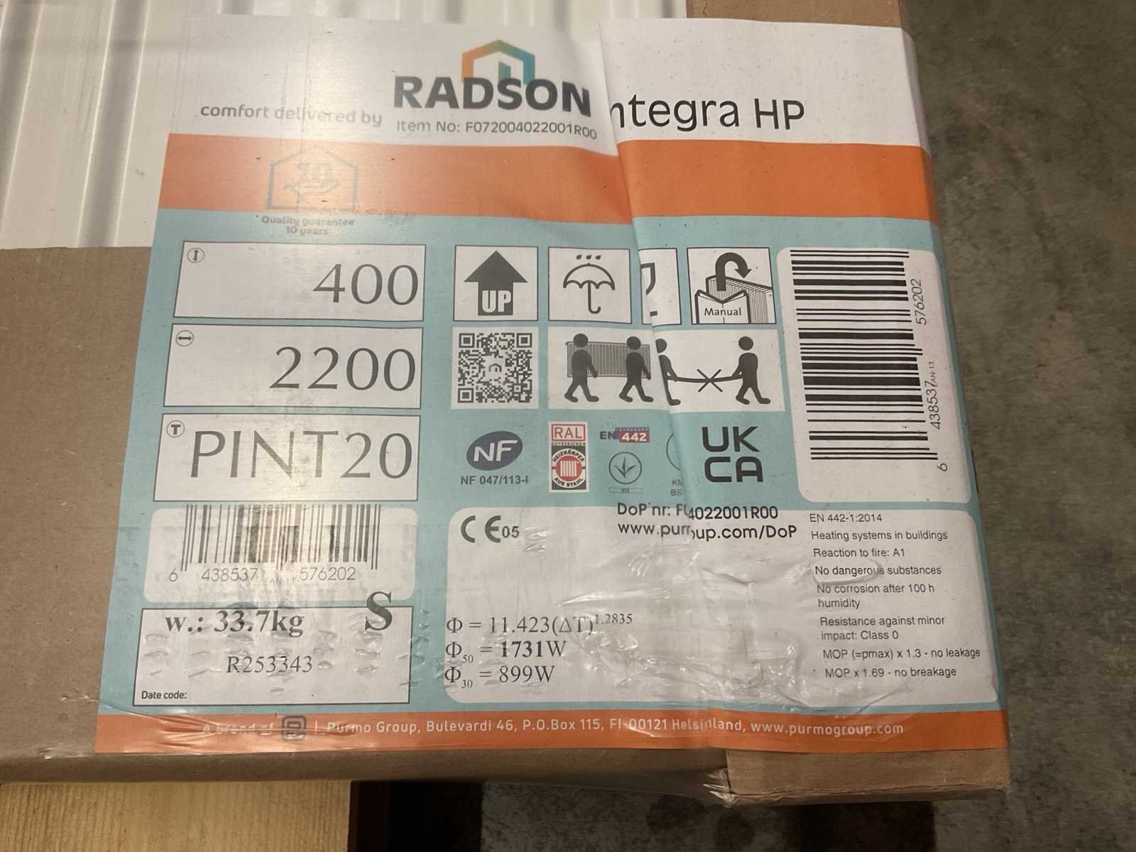 Kleur wit. Merk: Radson Type: Integra HP PINT20 400x2200mm Vermogen: 1731W Horizontaal: true Totale afmeting L: 2200mm Totale afmeting Hoogte: 400mm