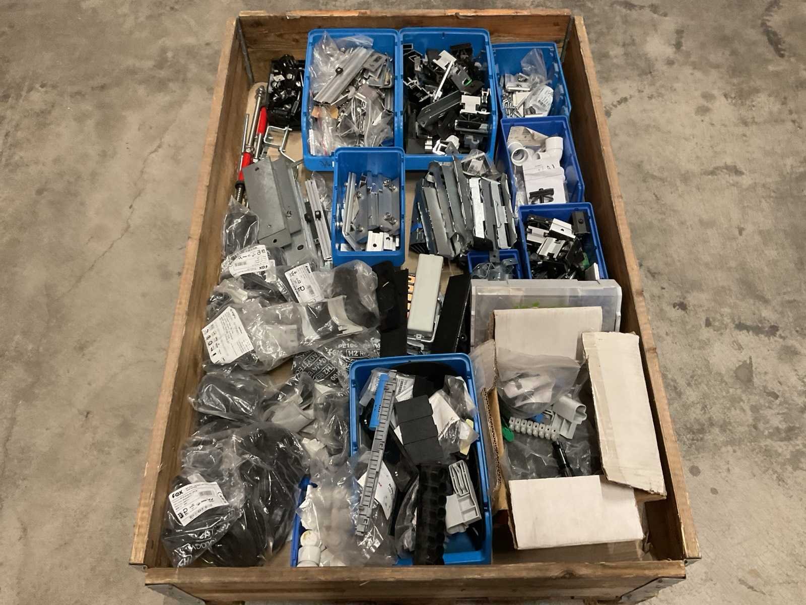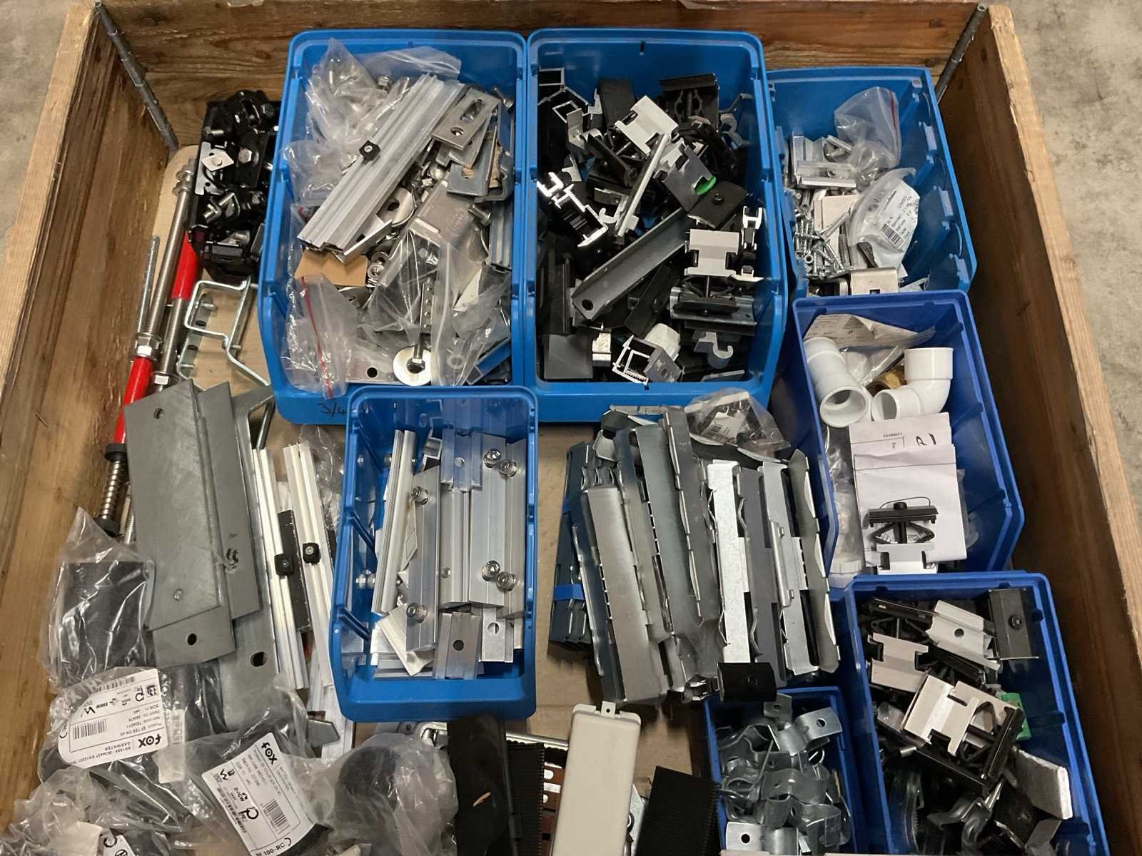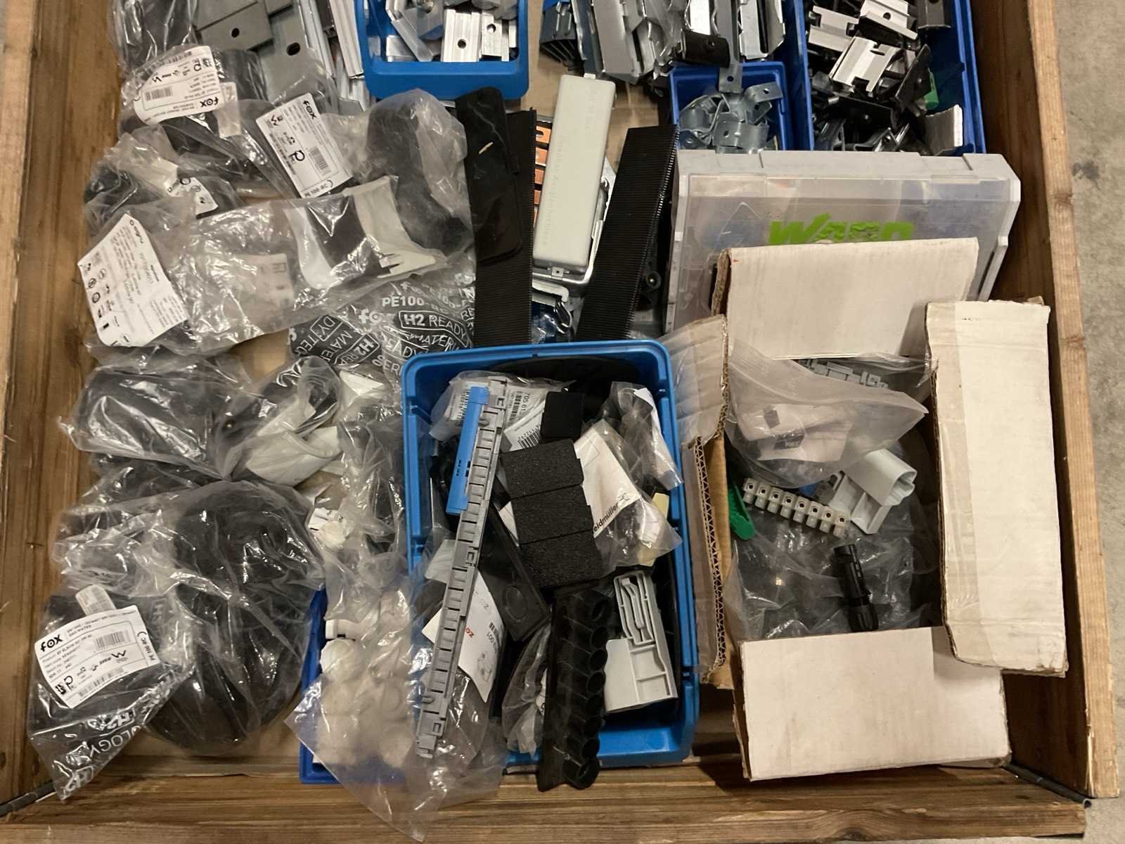 Bestaande uit: o.a. zonnepaneel connectoren, bevestiging- en montagemateriaal, elektrolas fittingen, etc., incl. magazijnbakken.
