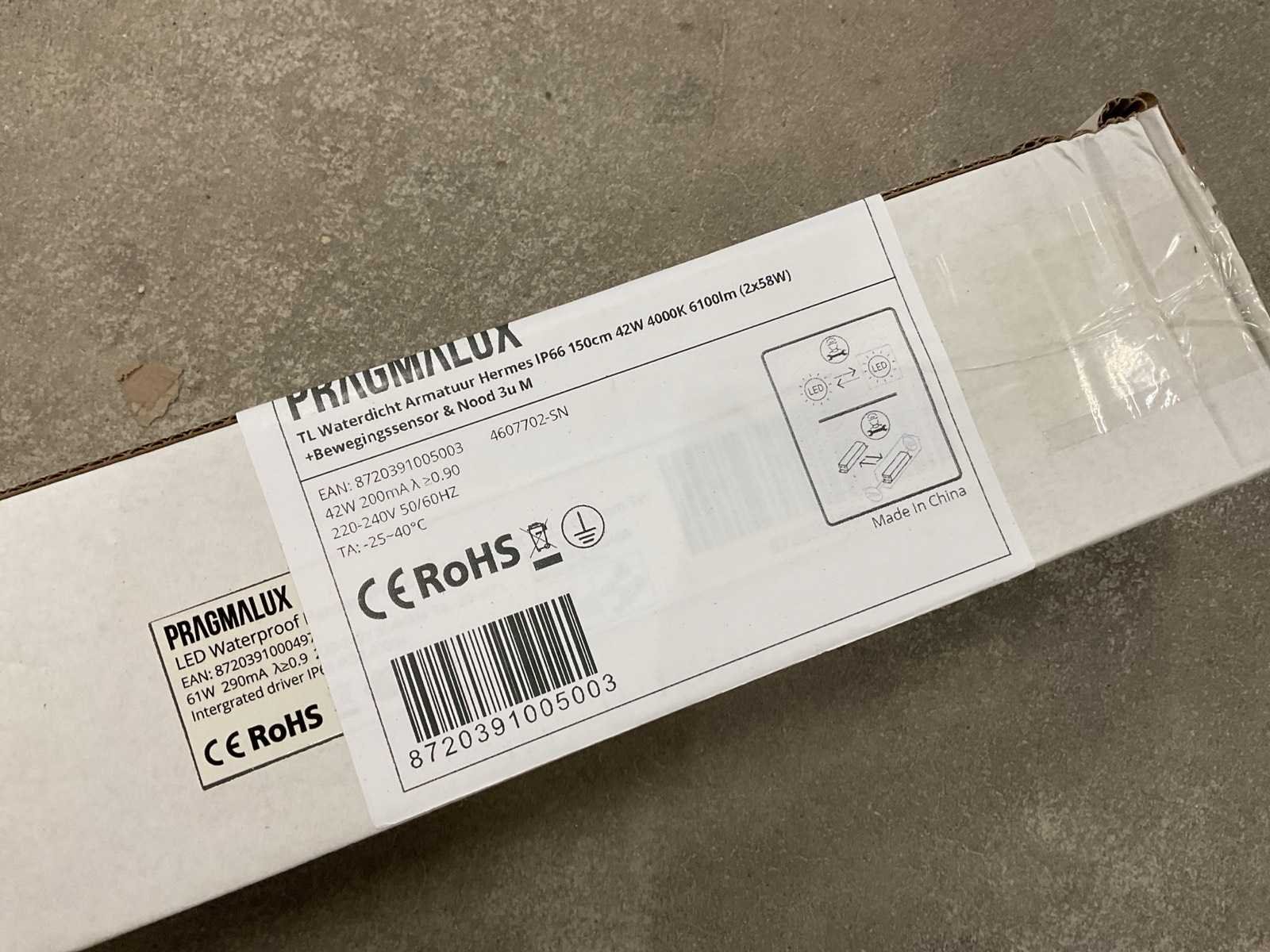 Met bewegingssensor & nood 3u, IP66, 6100lm, 230V. Merk: Pragmalux Model: Hermes 150cm Lichtbron: LED Kleurtemperatuur: 4000K Wattage: 42W Lengte: 150cm