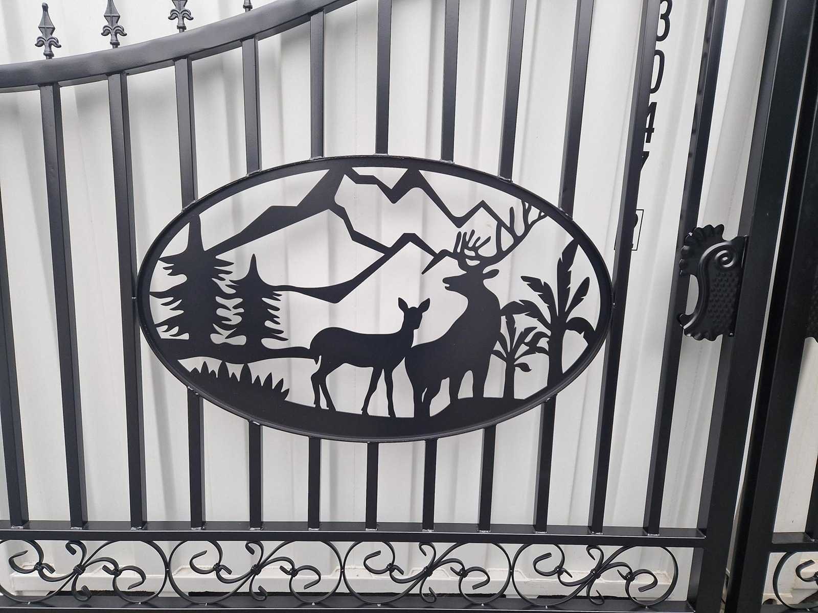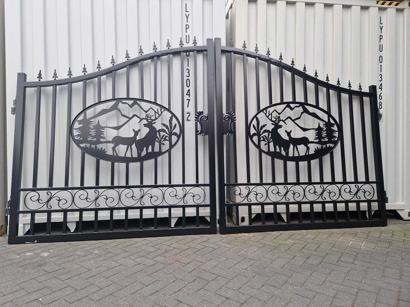 Poort van staal, zwarte coating, 422 cm breed, Hoogte; van 180 cm naar 230 cm ( buiten naar binnen), frame buiten kant 50 x 50 mm, spijlen 25 x 25 mm, aanlaspaumelle, ongebruikt Merk: Greenland Model: 422 cm Kleur: Zwart Breedte: 422cm