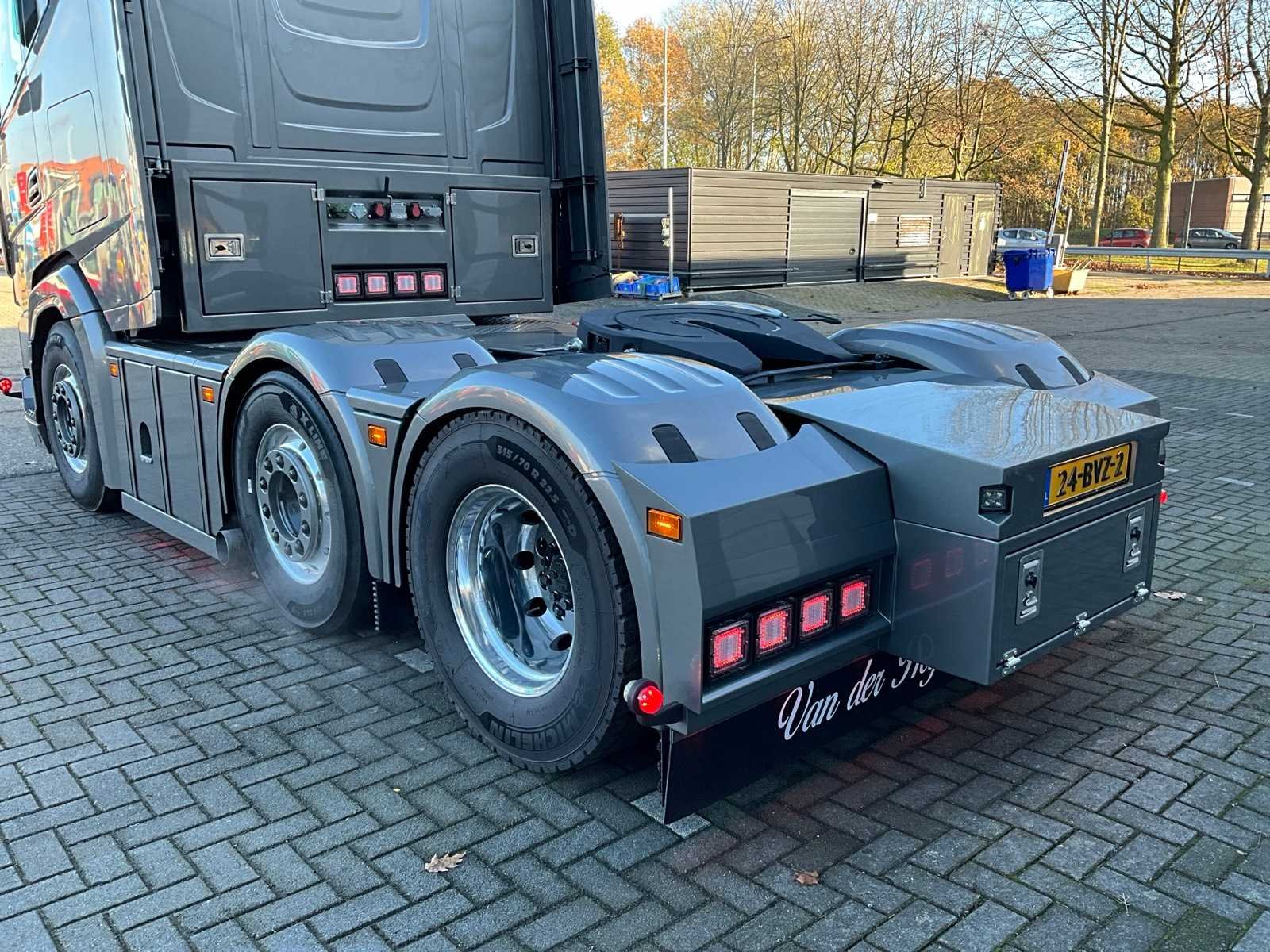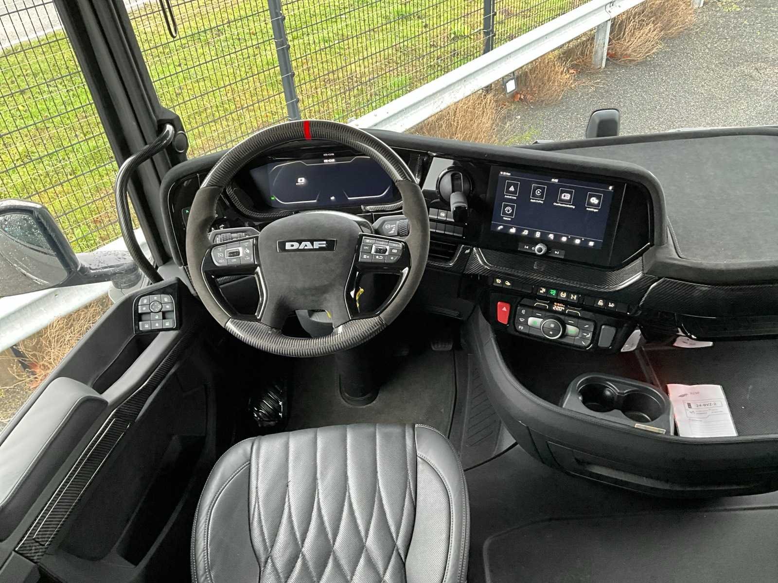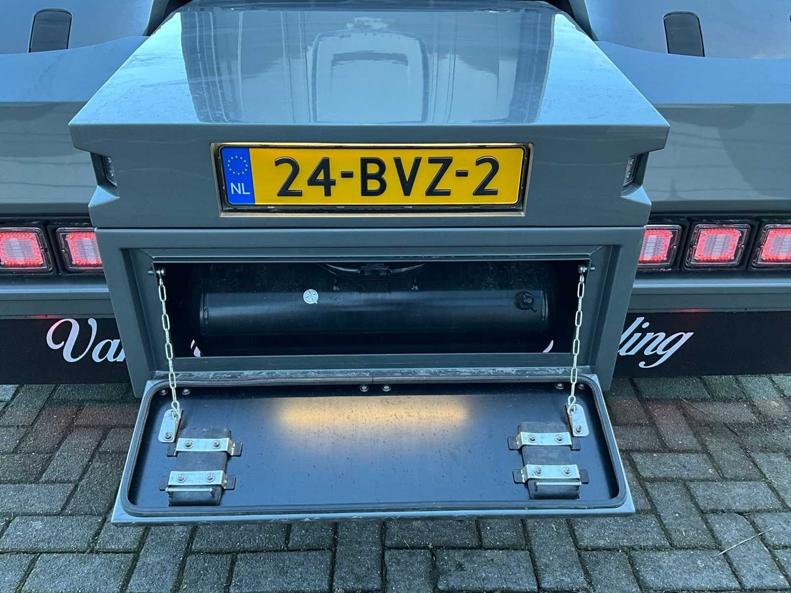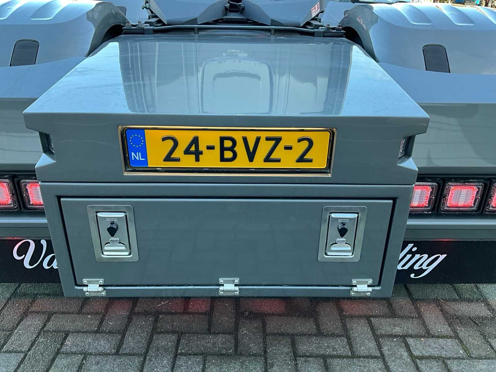 LED Balk en luchthoorns boven op dak Topverlichting voor en achter STRANDS verstralers RVS achterbumper met LED verlichting en een kist bij de luchtketel Vlakke plaat achter de schotel met kenteken en LED werklampen erin verwerkt Sideskirts met tankbanden en LED-verlichting Beugels onder de sideskirts met grond verlichting Vlonder half glad en half traanplaat met daarin kleppen bij de tankopeningen. Op maat gemaakte aluminium spatborden bij de vooras Slangenrek met led verlichting en deurtjes RVS gepolijst eindstuk bij de trekas aangesloten op de demper Spiegels en handvaten afgewerkt in carbon-look Interieur afgewerkt met carbon XG⁺ 530 FTG 6X2 Trekker Motor: MX-13-motor 390kw/530pk Cabinekleur .J. 5015MESI Vooras vóór 8,00t, luchtvering, 161N Bandenleverancier .Michelin Banden fr1 of voorassen 385/65R22.5 Banden aangedreven achteras(sen) 315/70R22.5 Retarder MX Engine Brake Brandstoftank(s) 710l alu br st tanks: 490 + 220L Voertuiggarantie warranty Plus-voertuig 2 jaar geen km limiet (va feb 2024) Koppelschotel : Jost JSK37E Schuifschotel Achterasgroep Achter 19,60t luchtvering Banden fr2 of voorloopas 385/55R22.5 Achterasoverbrenging: achterasverhouding 2,40 Connected Services : PACCAR Connect Uitlaatemissie Euro 6 Uitvoering versnellingsbak : Automatische versnellingsbak Traxon 12 versnellingen Wielbasis / achteroverbouw Wielbasis 3,95m / achteroverbouw 0,99m Voorzien van Climate Pack. Bevat de opties: Standairco, geïntegreerd (01967), gelaagd glas met zonnefolie (01886) en voorruit met zonnefolie (03232) PTO Voorbereid Kenteken: 24-BVZ-2 Merk: DAF Type: XG+ 530 FTG Bouwjaar: 2024 Chassisnummer VIN: XLRTGF5300G489629 Cilinderinhoud: 12902cc Kilometerstand bij opname: 400km APK vervaldatum: 2026-02-21 Datum eerste toelating: 2024-02-20 Datum eerste toelating (NL): 2024-02-20 Type transmissie: Automatisch Aantal assen: 3 Asconfiguratie: 6x2 Fuel Type: Diesel Laadvermogen: 17941kg Aantal sleutels: 1 Emissieklasse: 6 Slaapcabine: true Navigatie: true Eigen gewicht: 9059kg Aantal zitplaatsen: 2 Zelf rijdend exporteren: Mogelijk Automaat: true Diesel: true