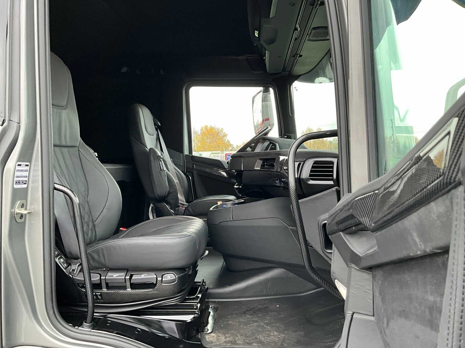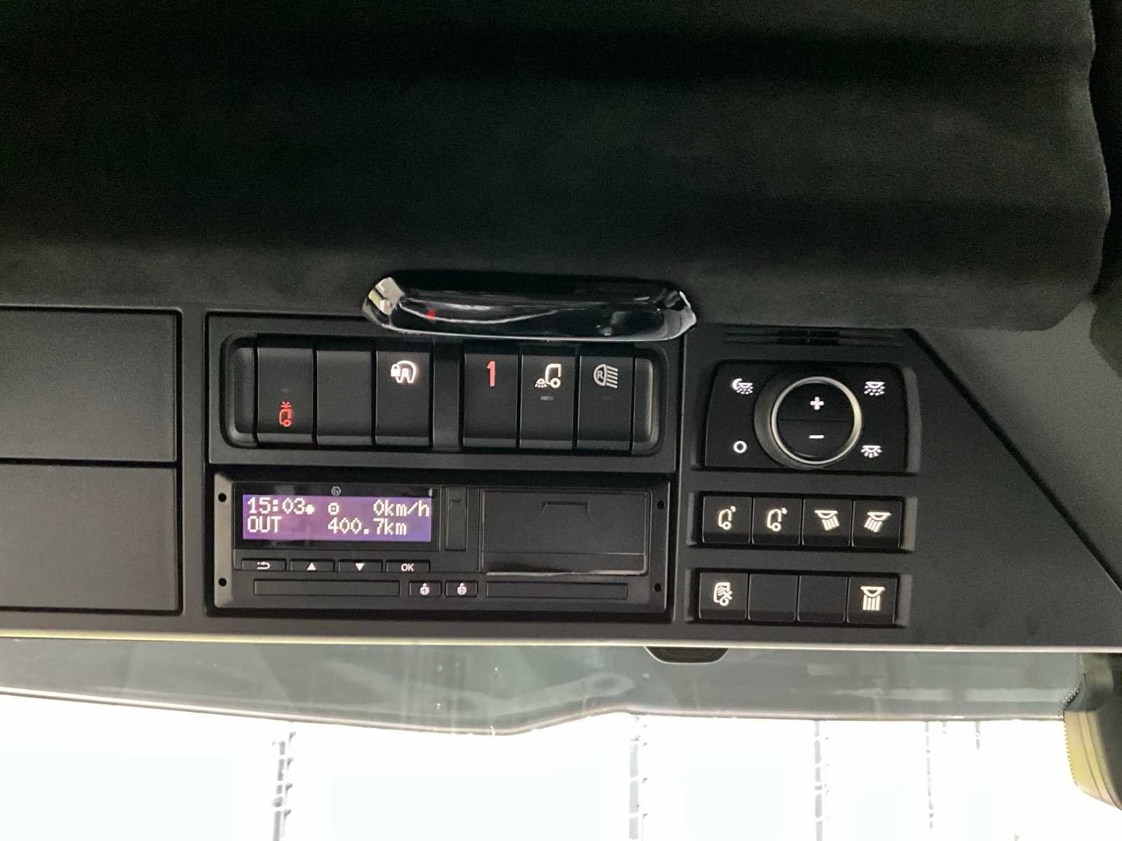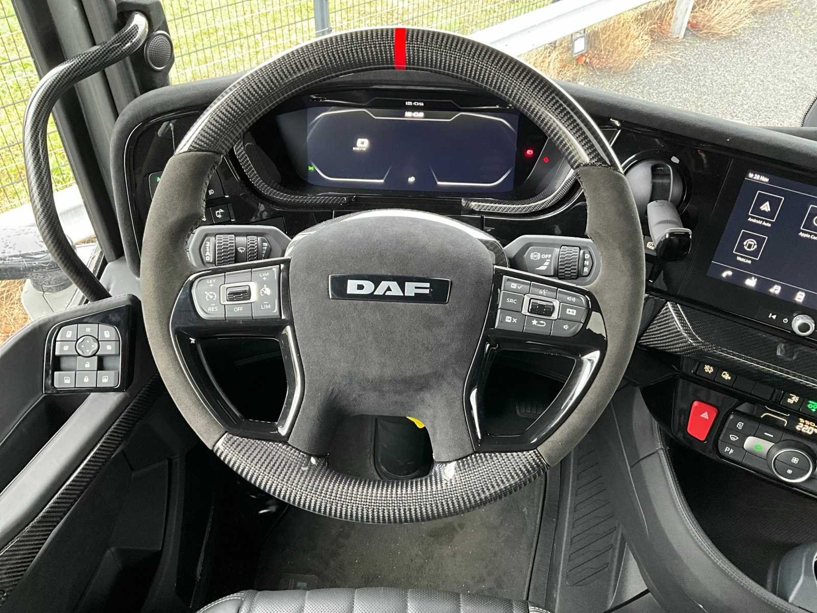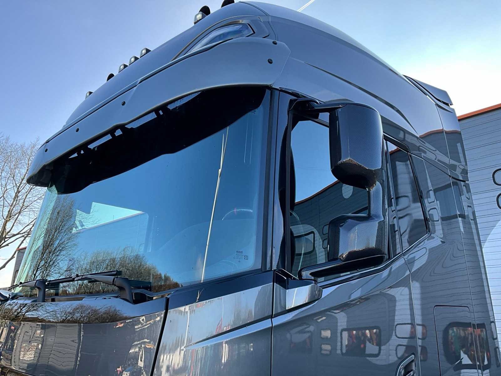 LED Balk en luchthoorns boven op dak Topverlichting voor en achter STRANDS verstralers RVS achterbumper met LED verlichting en een kist bij de luchtketel Vlakke plaat achter de schotel met kenteken en LED werklampen erin verwerkt Sideskirts met tankbanden en LED-verlichting Beugels onder de sideskirts met grond verlichting Vlonder half glad en half traanplaat met daarin kleppen bij de tankopeningen. Op maat gemaakte aluminium spatborden bij de vooras Slangenrek met led verlichting en deurtjes RVS gepolijst eindstuk bij de trekas aangesloten op de demper Spiegels en handvaten afgewerkt in carbon-look Interieur afgewerkt met carbon XG⁺ 530 FTG 6X2 Trekker Motor: MX-13-motor 390kw/530pk Cabinekleur .J. 5015MESI Vooras vóór 8,00t, luchtvering, 161N Bandenleverancier .Michelin Banden fr1 of voorassen 385/65R22.5 Banden aangedreven achteras(sen) 315/70R22.5 Retarder MX Engine Brake Brandstoftank(s) 710l alu br st tanks: 490 + 220L Voertuiggarantie warranty Plus-voertuig 2 jaar geen km limiet (va feb 2024) Koppelschotel : Jost JSK37E Schuifschotel Achterasgroep Achter 19,60t luchtvering Banden fr2 of voorloopas 385/55R22.5 Achterasoverbrenging: achterasverhouding 2,40 Connected Services : PACCAR Connect Uitlaatemissie Euro 6 Uitvoering versnellingsbak : Automatische versnellingsbak Traxon 12 versnellingen Wielbasis / achteroverbouw Wielbasis 3,95m / achteroverbouw 0,99m Voorzien van Climate Pack. Bevat de opties: Standairco, geïntegreerd (01967), gelaagd glas met zonnefolie (01886) en voorruit met zonnefolie (03232) PTO Voorbereid Kenteken: 24-BVZ-2 Merk: DAF Type: XG+ 530 FTG Bouwjaar: 2024 Chassisnummer VIN: XLRTGF5300G489629 Cilinderinhoud: 12902cc Kilometerstand bij opname: 400km APK vervaldatum: 2026-02-21 Datum eerste toelating: 2024-02-20 Datum eerste toelating (NL): 2024-02-20 Type transmissie: Automatisch Aantal assen: 3 Asconfiguratie: 6x2 Fuel Type: Diesel Laadvermogen: 17941kg Aantal sleutels: 1 Emissieklasse: 6 Slaapcabine: true Navigatie: true Eigen gewicht: 9059kg Aantal zitplaatsen: 2 Zelf rijdend exporteren: Mogelijk Automaat: true Diesel: true