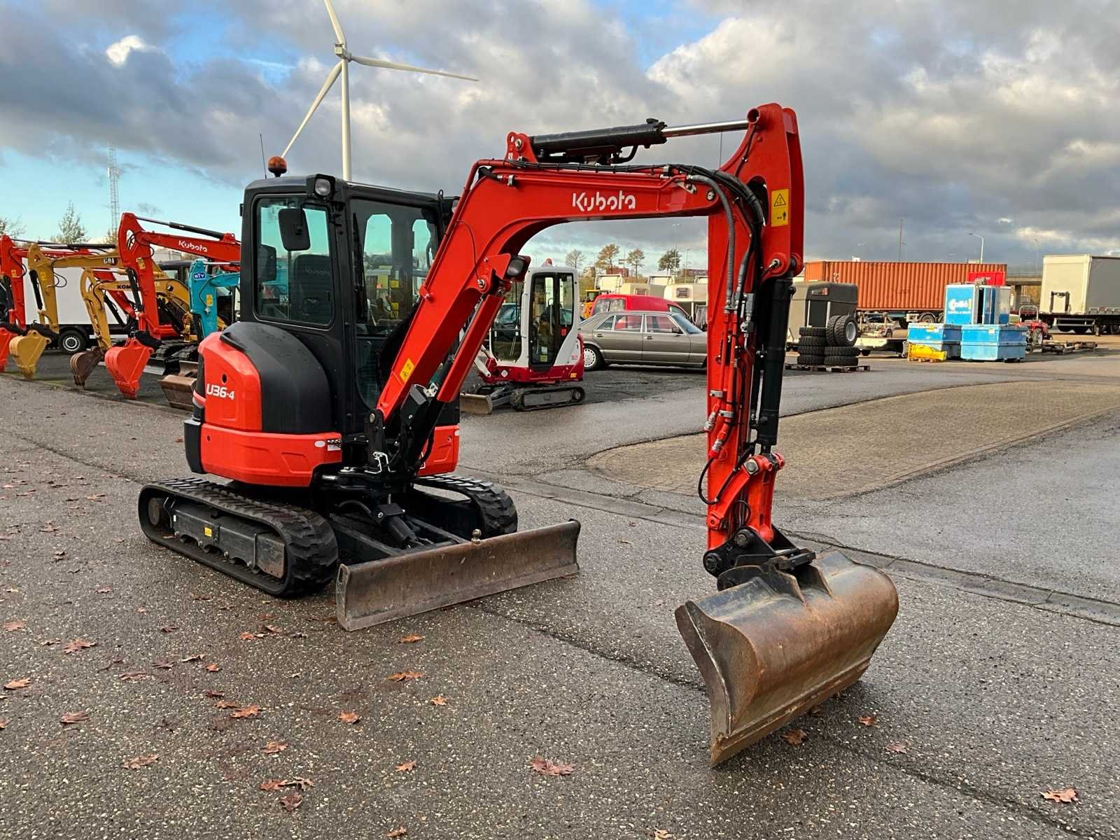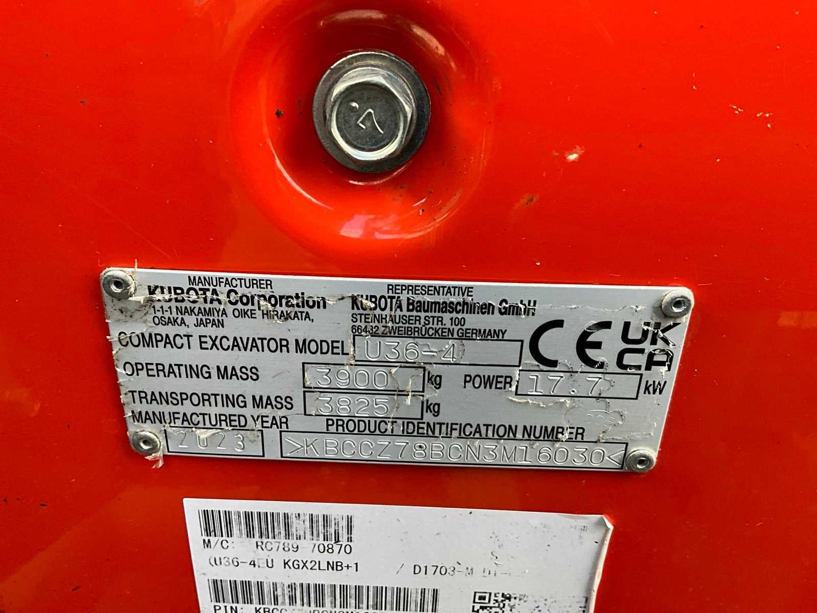 CW05 Hydraulische snelwissel, CW05 slotenbak 1200mm, 3e + 4e functie, zwenkgiek, schuifblad, slangbreukbeveiliging, airco, automatische vetsmering, 2e rijsnelheid, Auto Idle, AntiTheft met rode sleutel Merk: Kubota Type: U36-4 Hi Spec Bouwjaar: 2023 Serienummer: 16030 Merk motor: Kubota D1703-M-DI-E4 Motorvermogen (kW): 18kW Aantal cilinders: 3 Brandstof: Diesel Bedrijfsgewicht: 3755kg Inclusief graafbak: Yes Graafbak afm. b: 1200mm Rups breedte: 300mm Afgelezen urenstand: 903 Totale afmeting L: 5000mm Totale afmeting Breedte: 1700mm Totale afmeting Hoogte: 2500mm