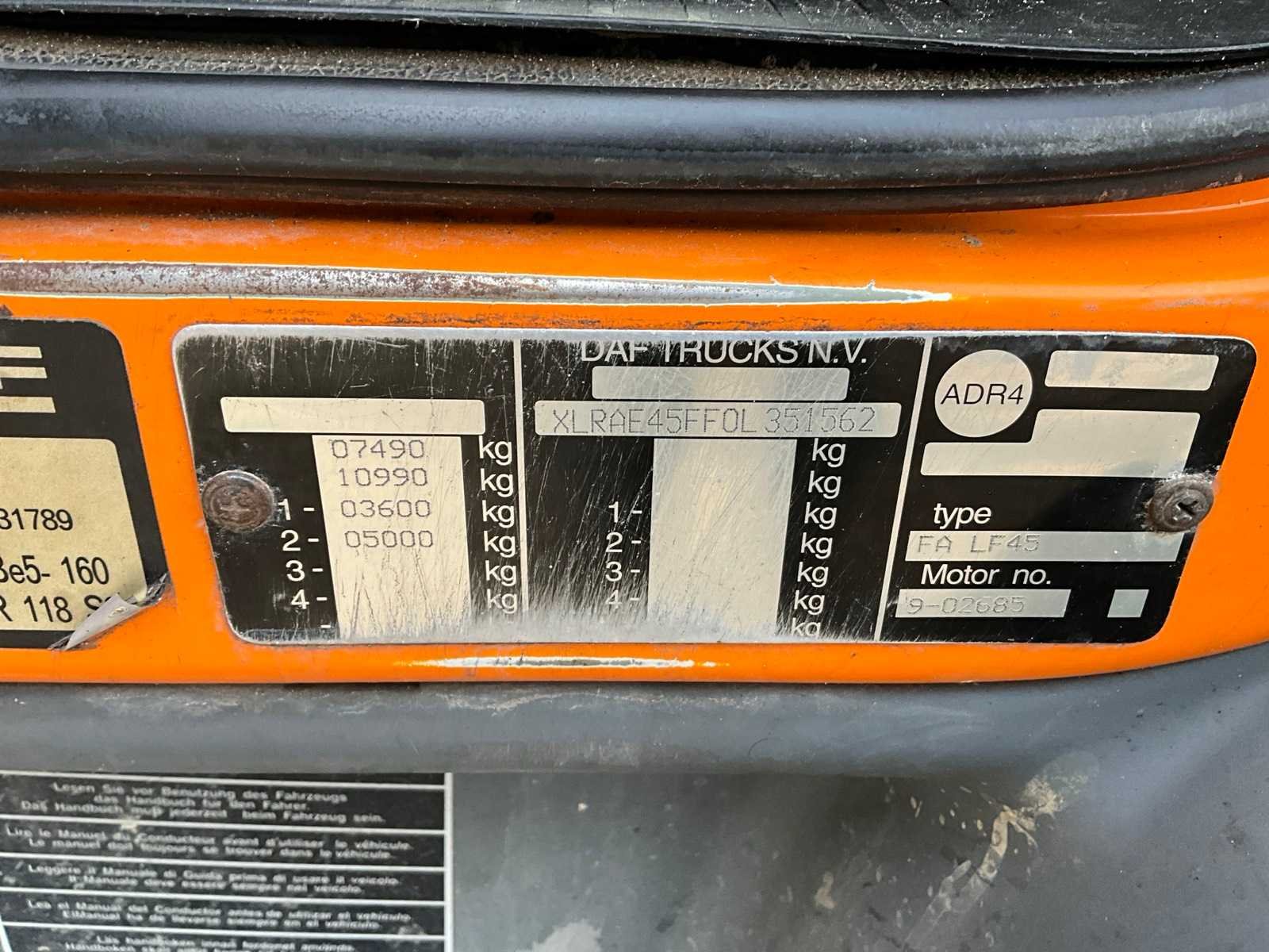 Ingebouwde warmwater hogedrukreiniger installatie ( werking en compleetheid niet getest), watertank, Afmeting laadbak LxBxH 5200x2450x1600mm, Elektrische ramen, motor rem, sperdifferentieel, digitale tachograaf, Kenteken: BX-TP-83 Merk: DAF Type: 45.160 Bouwjaar: 2010 Chassisnummer VIN: XLRAE45FF0L35162 Cilinderinhoud: 4462cc Kilometerstand bij opname: 332810km APK vervaldatum: 2025-01-09 Datum eerste toelating: 2010-10-12 Datum eerste toelating (NL): 2010-10-12 Type transmissie: Handmatig Aantal assen: 2 Asconfiguratie: 4x2 Fuel Type: Diesel Laadvermogen: 2920kg Emissieklasse: 5 Gesloten opbouw: true Eigen gewicht: 4670kg Totale afmeting L: 7000mm Totale afmeting Breedte: 2200mm Totale afmeting Hoogte: 2800mm Nationaliteit documenten: Nederland Aantal zitplaatsen: 2 Zelf rijdend exporteren: Niet mogelijk Handgeschakelde versnellingsbak: true