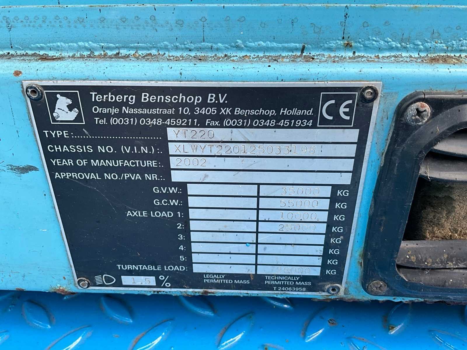 Volvo Penta TAD720 6-cilinder diesel motor, Allison versnellingsbak, 6490 uur, minimale schotelhoogte 1150mm maximale 1900mm, Sper Merk: Terberg Type: YT220 Bouwjaar: 2002 Chassisnummer VIN: XLWYT220125033196 Type transmissie: Automaat Aantal assen: 2 Fuel Type: Diesel Totale afmeting L: 5000mm Totale afmeting Breedte: 2500mm Totale afmeting Hoogte: 3500mm