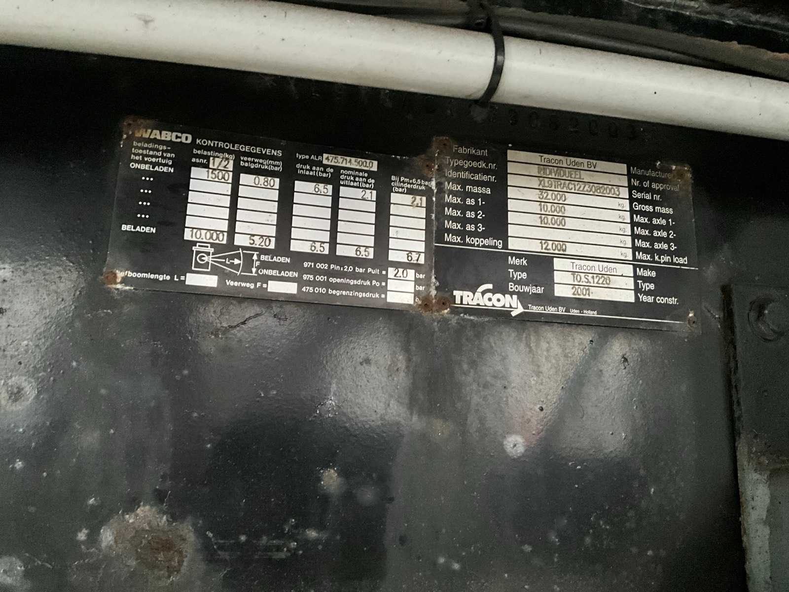 Gestuurde achteras, DHollandia LM6 laadklep Merk: Tracon Type: TOS1220 Type aanhangwagencarrosserie: Gesloten aanhangwagen Bouwjaar: 2001 Chassisnummer VIN: XL9TRAC12Z3082003 Kenteken: OG-89-RH Datum eerste toelating (NL): 2001-06-13 Datum eerste toelating: 2001-06-13 APK vervaldatum: 2023-04-19 Aantal assen: 3 Laadvermogen: 23060kg Totale afmeting L: 14000mm Totale afmeting Breedte: 2500mm Totale afmeting Hoogte: 4000mm
