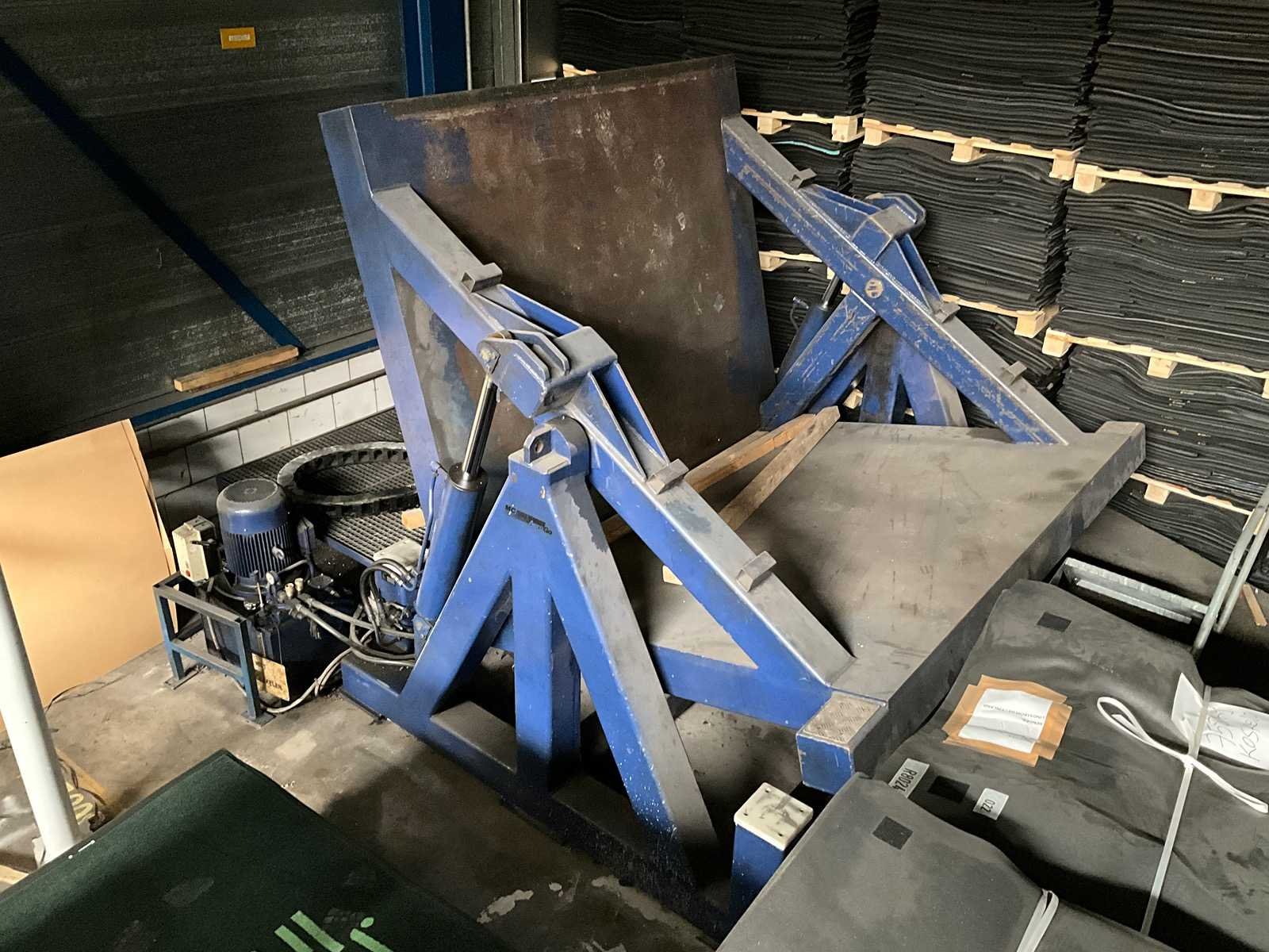 Hydraulische kantelaar met hydropack Merk: M.C. Type: KT30 Bouwjaar: 1993 Serienummer: 25720 Aansluiting: 380V Eigen gewicht: 7000kg Kratafmeting l: 2000mm Kratafmeting b: 2200mm Totale afmeting L: 3100mm Totale afmeting Breedte: 2700mm Totale afmeting Hoogte: 2900mm