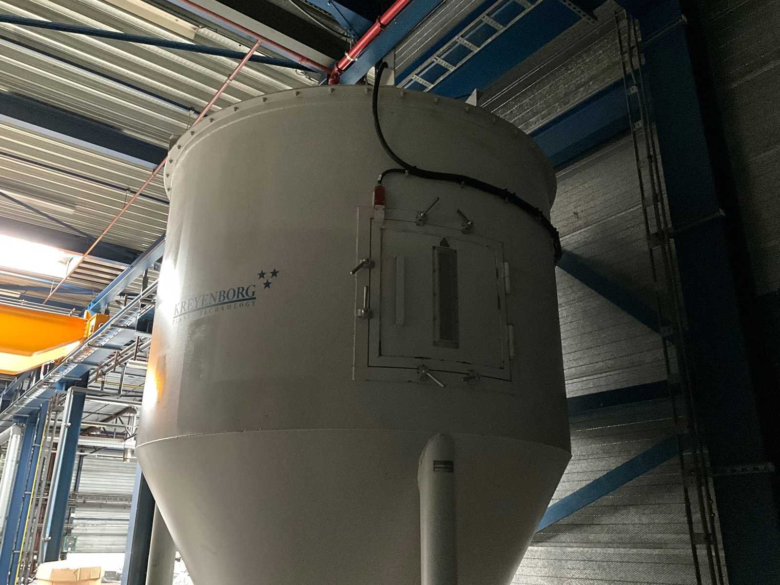 7.5m3 Opslag silo met ingebouwde vijzel, pneumatische vlinderklep Merk: Kreyenborg Staal: true Capaciteit.: 7500l Mangat: true Totale afmeting Breedte: 2300mm Totale afmeting Hoogte: 6000mm