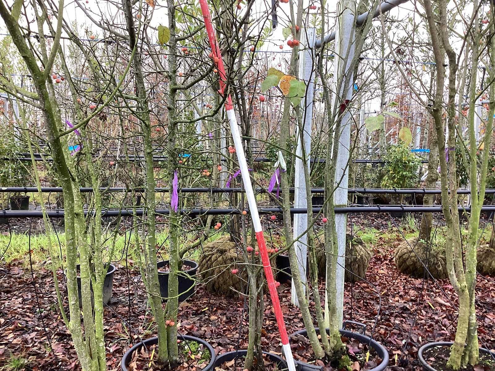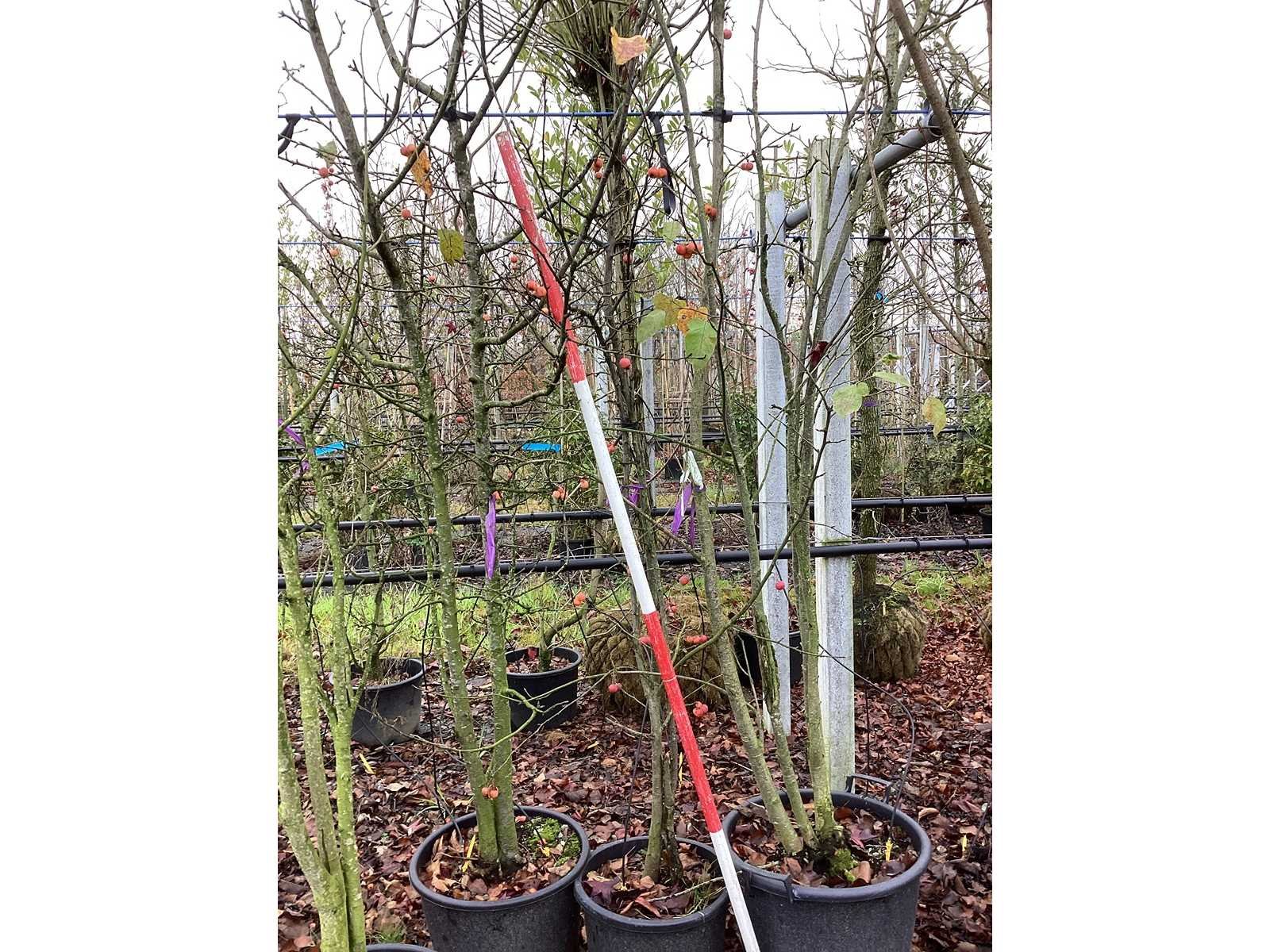 De kavels worden door ons verzameld en klaargelegd voor transport; Wilt u gebruik maken van de bezorgservice neem dan contact op via het emailadres info@groviatrees.com. Laat dit voor week 51 weten zodat we zo snel mogelijk uw planten kunnen laten bezorgen. Als tip, de bomen zitten nu in de winterrust dus wilt u graag weten wat de zomer- en de herfstkleuren zijn, kijk dan op internet daar staan hele mooie voorbeelden van de bomen. Type: Sierappel Latijnse benaming: Malus Hoogte ca.: 350cm In pot: true Stamdikte: 6cm