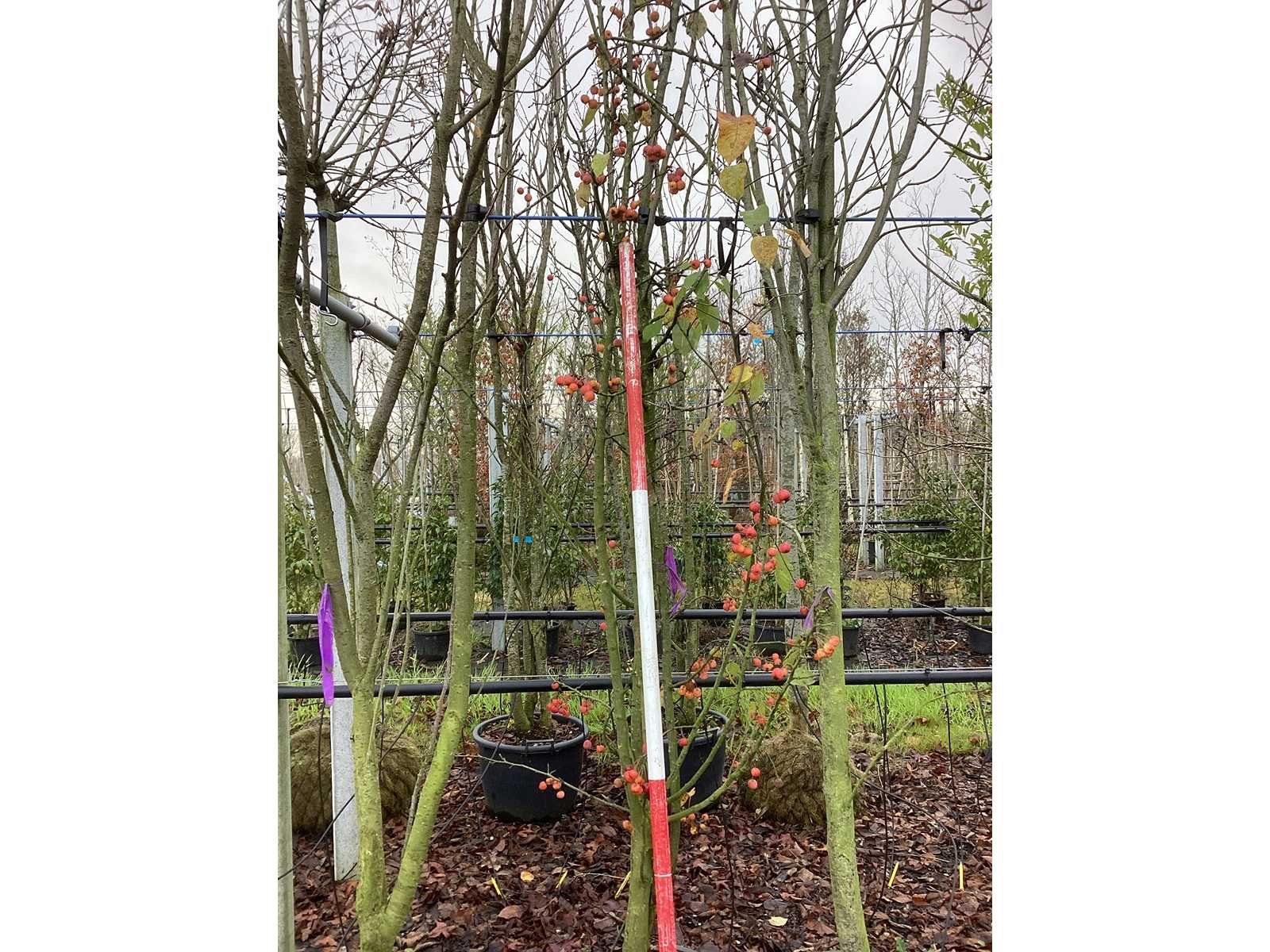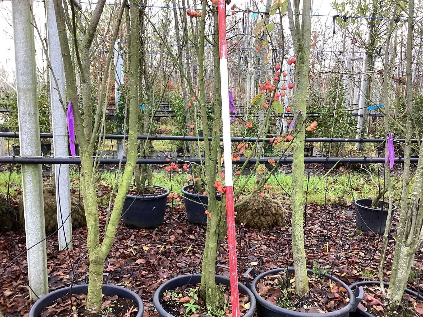 De kavels worden door ons verzameld en klaargelegd voor transport; Wilt u gebruik maken van de bezorgservice neem dan contact op via het emailadres info@groviatrees.com. Laat dit voor week 51 weten zodat we zo snel mogelijk uw planten kunnen laten bezorgen. Als tip, de bomen zitten nu in de winterrust dus wilt u graag weten wat de zomer- en de herfstkleuren zijn, kijk dan op internet daar staan hele mooie voorbeelden van de bomen. Type: Sierappel Latijnse benaming: Malus evereste Hoogte ca.: 450cm In pot: true Stamdikte: 6cm