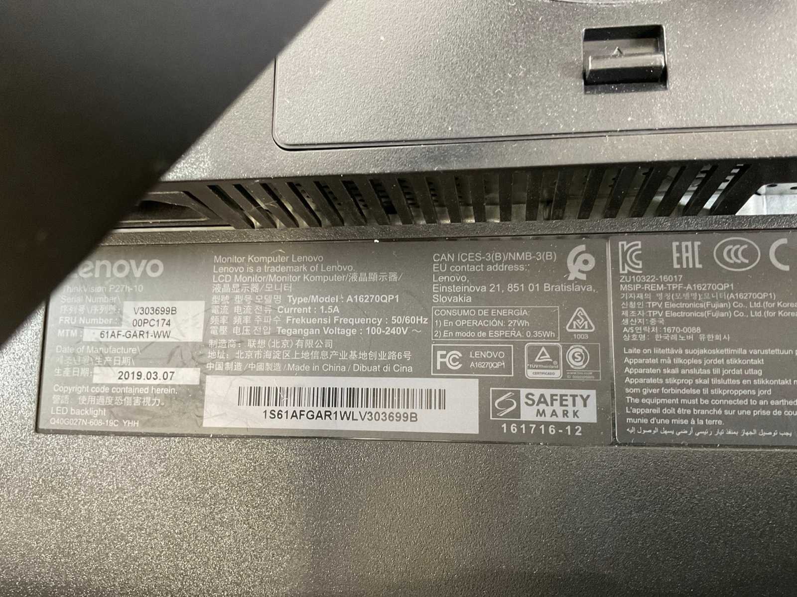 Lenovo (p27h-10) 27”, 2560x1440 (qhd) ips monitor