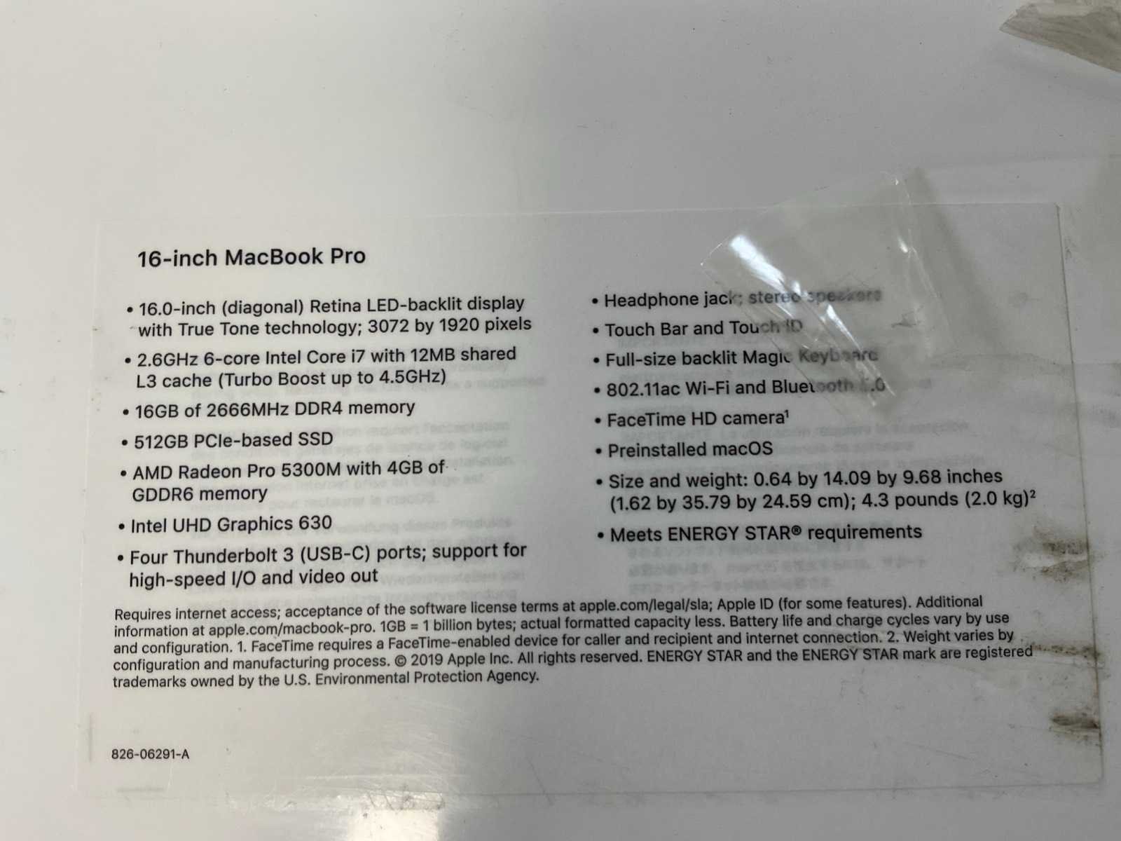 MacBook Pro 16”, Core(R) i7 9th Gen, 16 GB RAM, 512 GB SSD, AMD Radeon Pro 5300M 4 GB Laptop; - New in Box. Merk: Apple Processor type: Intel(R) Core(TM) i7-9750H Processorsnelheid Ghz: 2.60 RAM Geheugen: 16GB RAM Geheugen Type: DDR4 Totale opslagcapaciteit: 512GB Type datadrager: SSD Type videokaart: AMD Radeon Pro 5300M 4 GB Beeldscherm type: IPS Resolutie: 3072x1920 Beelddiagonaal: 16'' Wifi: true Bluetooth: true USB-Type: Type C USB poorten: 4 Webcam: true