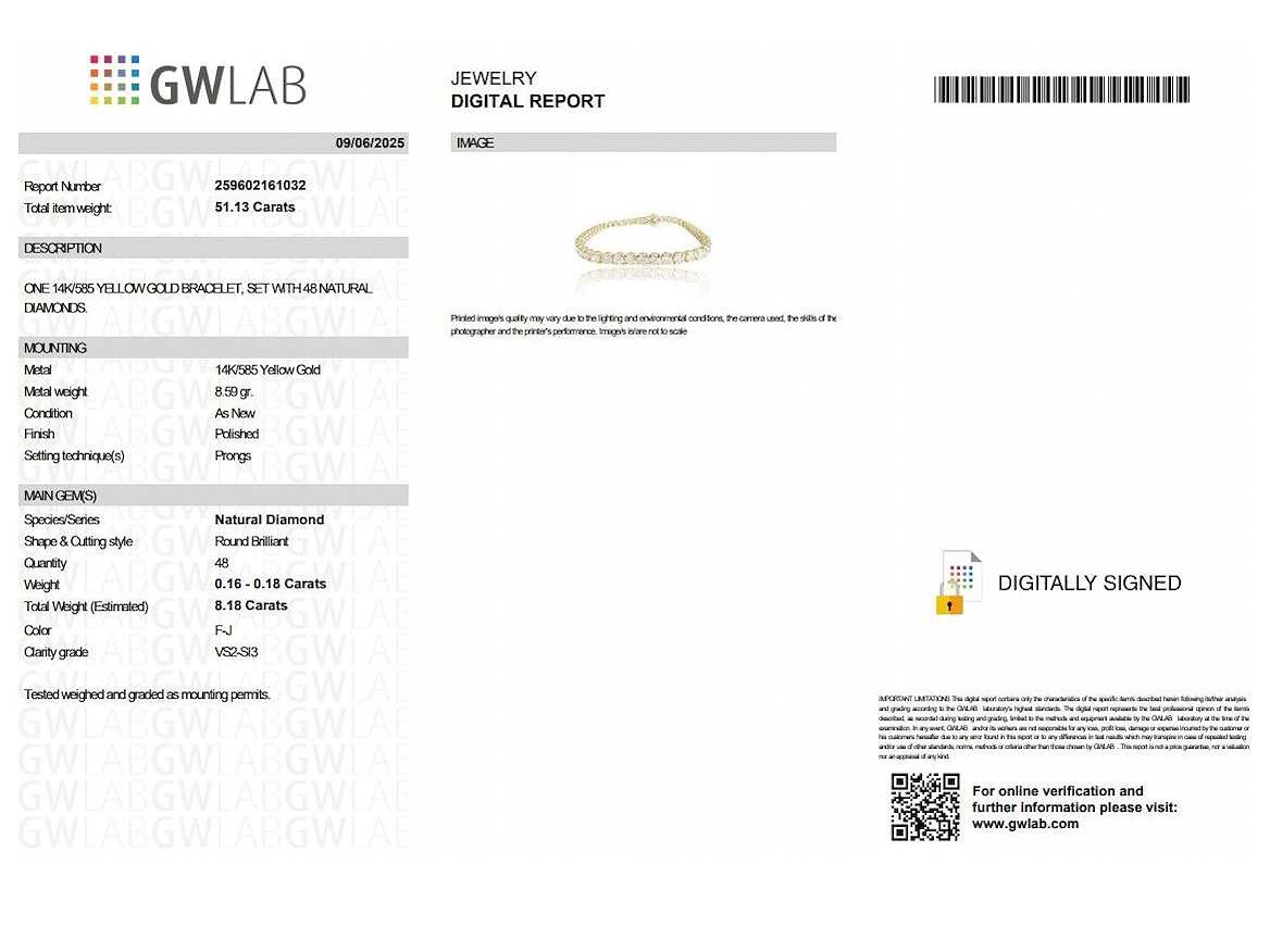 Exclusieve diamanten tennisarmband van topkwaliteit Met speciale natuurlijke kleur. GW-certificaat nr. 259602161032 Natuurlijke diamanten Slijpvorm: Rond Briljant Karaat: 8,18ct Kleur: F-J Helderheid: VS2-SI3 Totaalgewicht: 10,22 gram Bezichtigen op afspraak Materiaal: Geelgoud Certificaat: Ja Lage schatting: 17900€