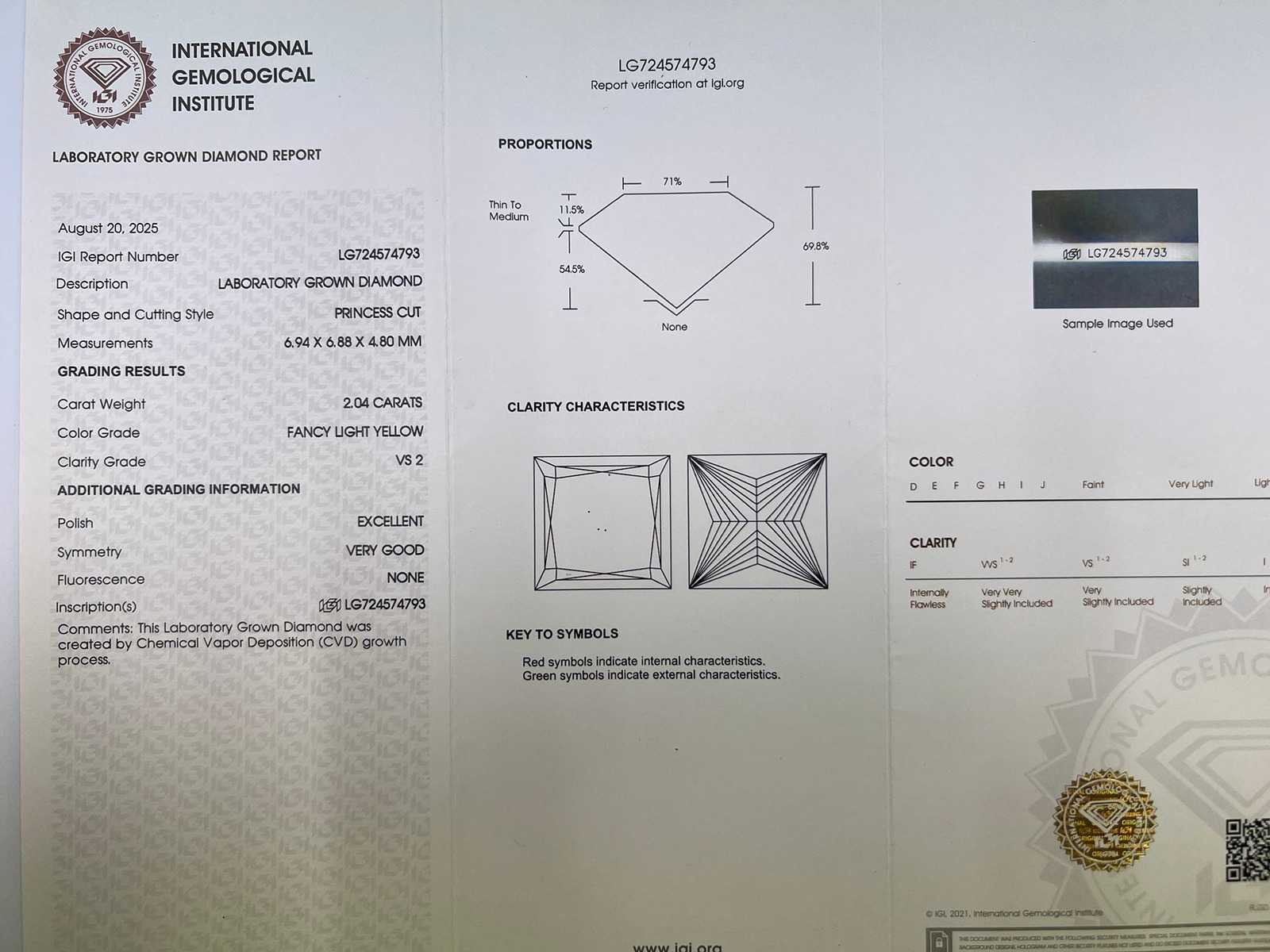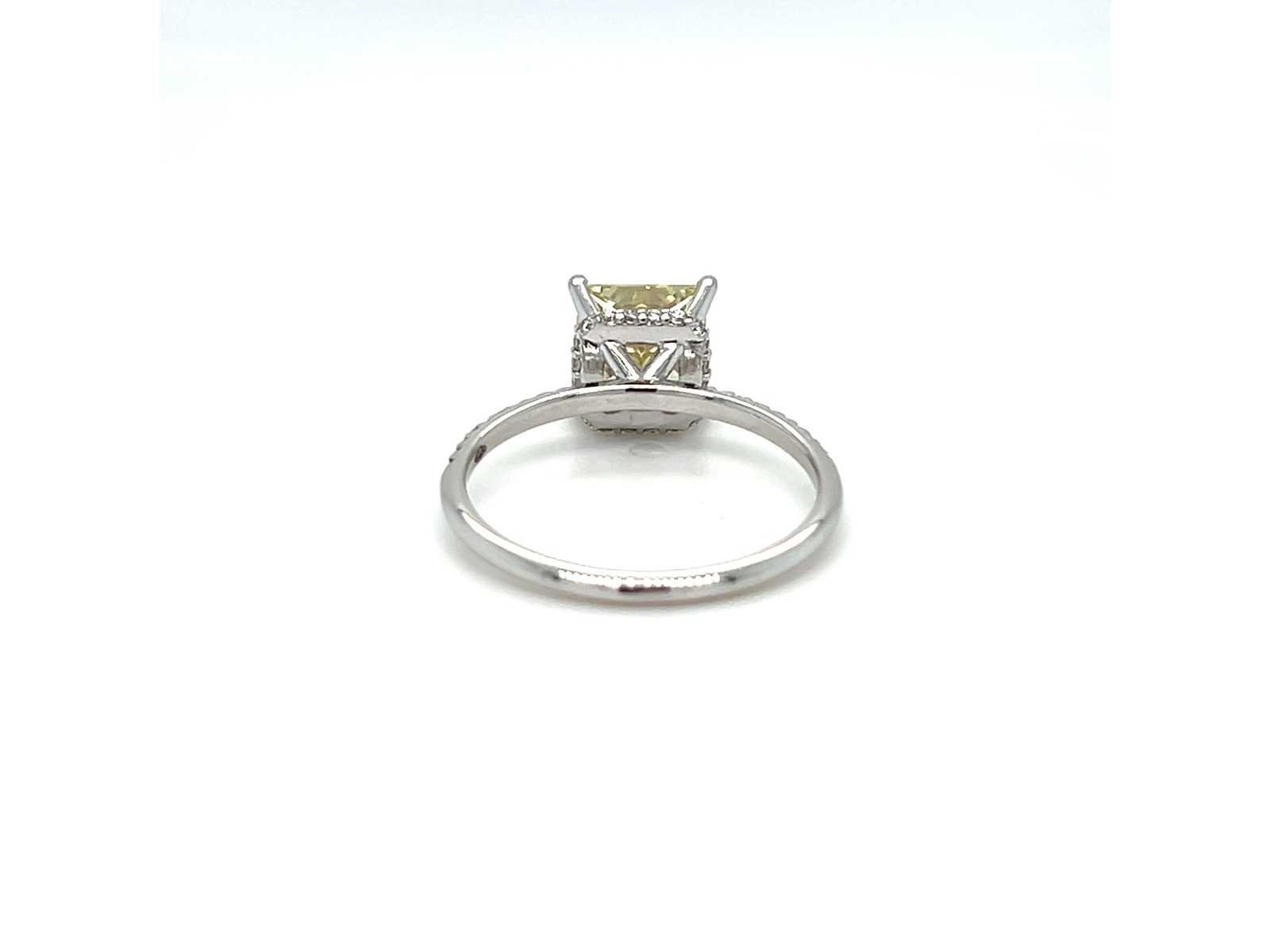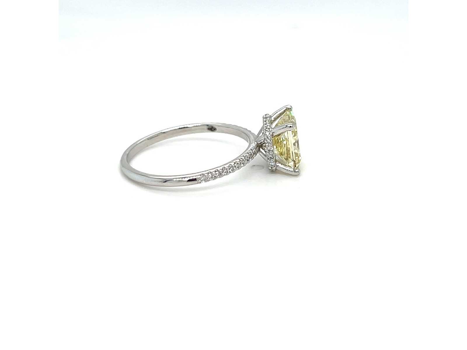 Rapportnummer IGI: LG724574793 Vorm: prinses Gewicht: 2,04 ct Kleur: Fancy lichtgeel Zuiverheid: VS2 Slijpkwaliteit: Uitstekend Symmetrie: Uitstekend Fluorescentie: Geen Zijstenen: 40 stuks 0,20 ct rond Bezichtiging op afspraak Materiaal: Witgoud Ringmaat : 54 Certificaat: Ja Lage schatting: 5900€