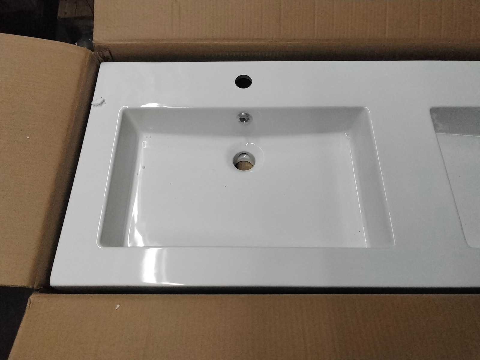 Dubbele wastafel met 2 kraangaten. 1 Afvoer. Kleur: Wit Lengte: 47cm Breedte: 122cm